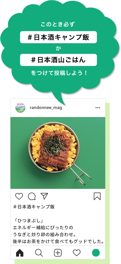 「#日本酒キャンプ飯」か「#日本酒山ごはん」をつけて投稿しよう!