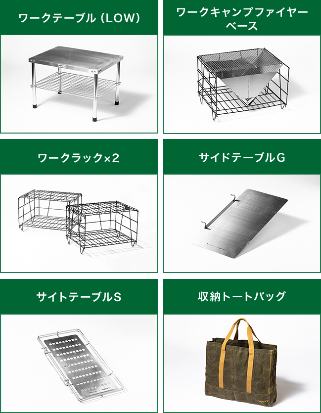 「テンマクデザイン」と小雀陣二さんがコラボレーションしたキャンプ料理に最適なテーブル、ラック、焚火台のセット。すべてが収納できるトートバッグもおつけします!