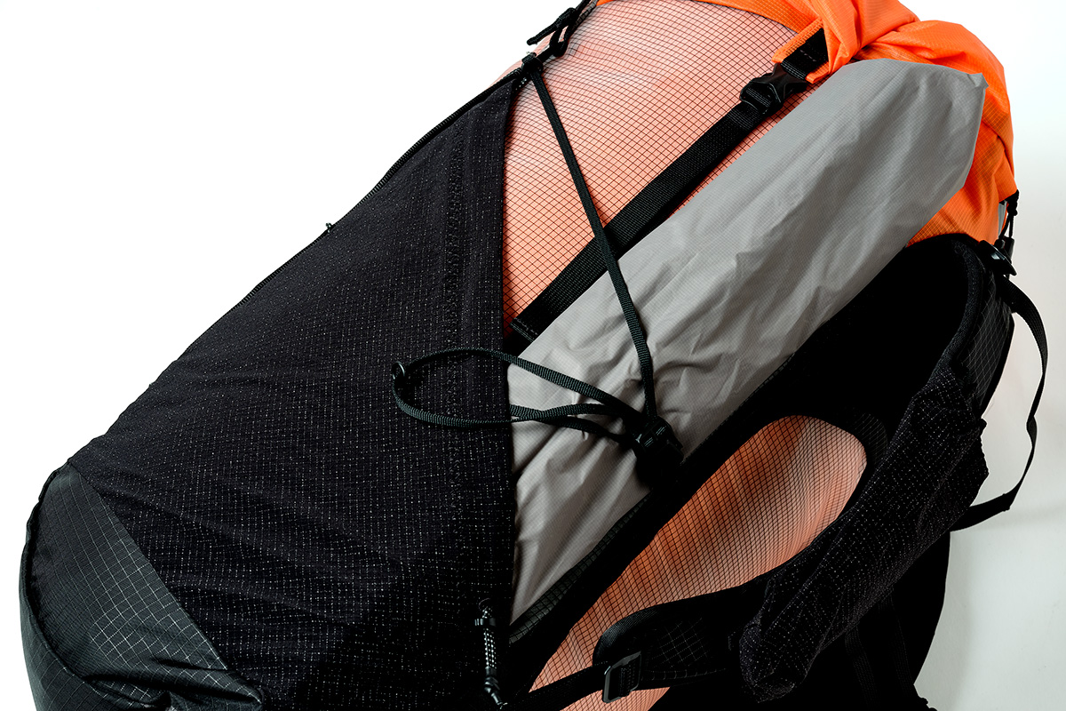 45ℓモデルには、背面のショルダーハーネスの付け根の間に、ミニマムなストレッチポケットを追加。ノールックで出し入れできる。