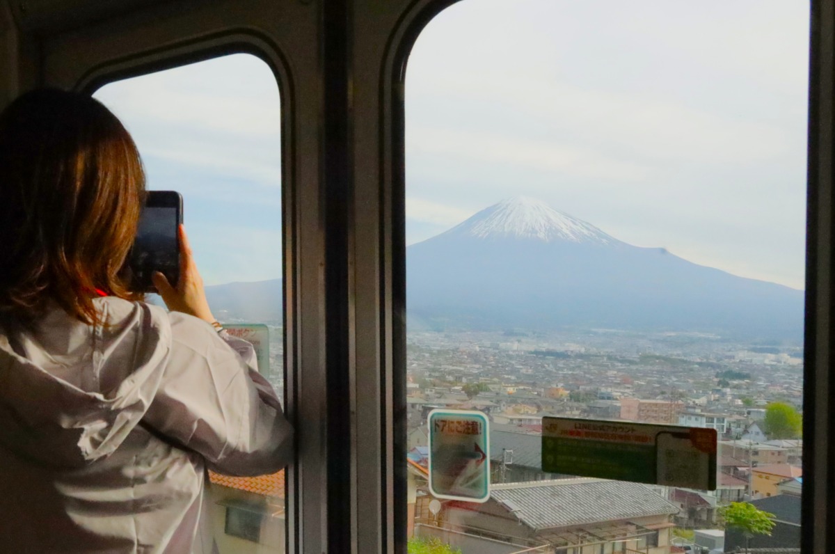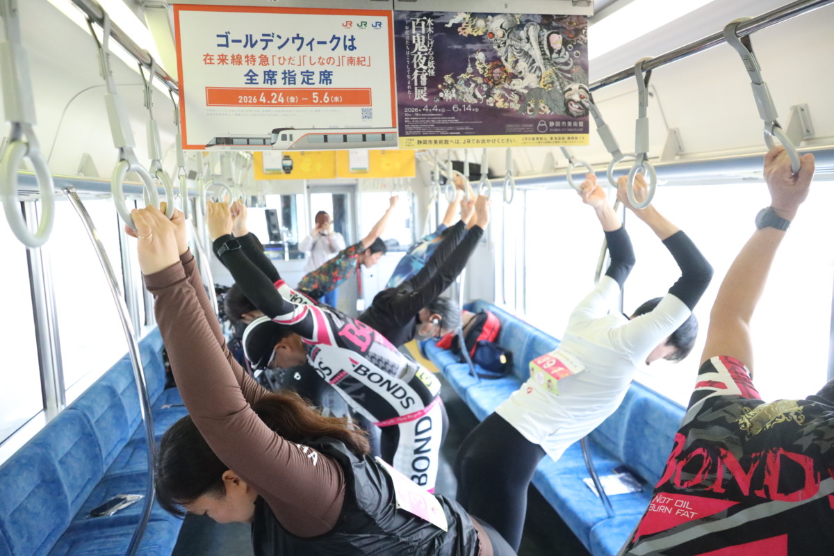 目的地に着く頃には、すでに気分はライドモード全開だ。富士宮駅を通過すると、眼下には富士宮の町と富士山を眺めることができる。さらに車内では普段できないつり革ストレッチなど、エース栗原さん指導のもと、エクササイズを楽しむことができた。