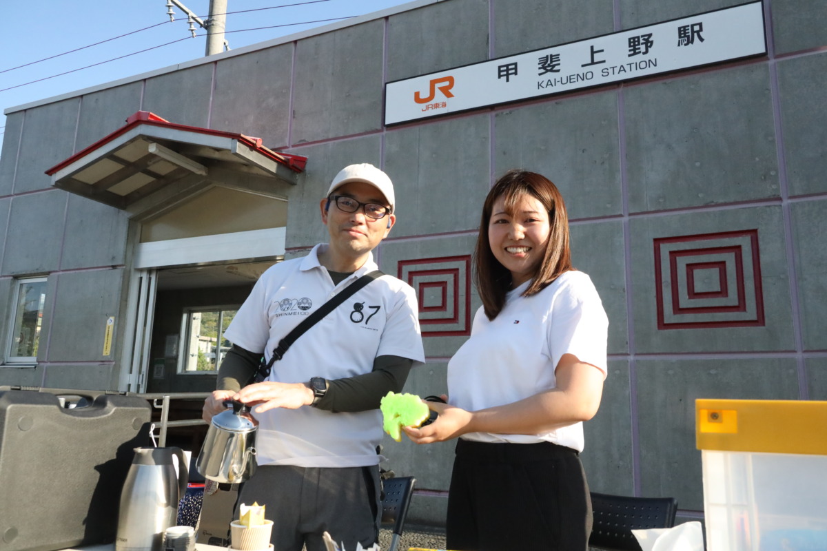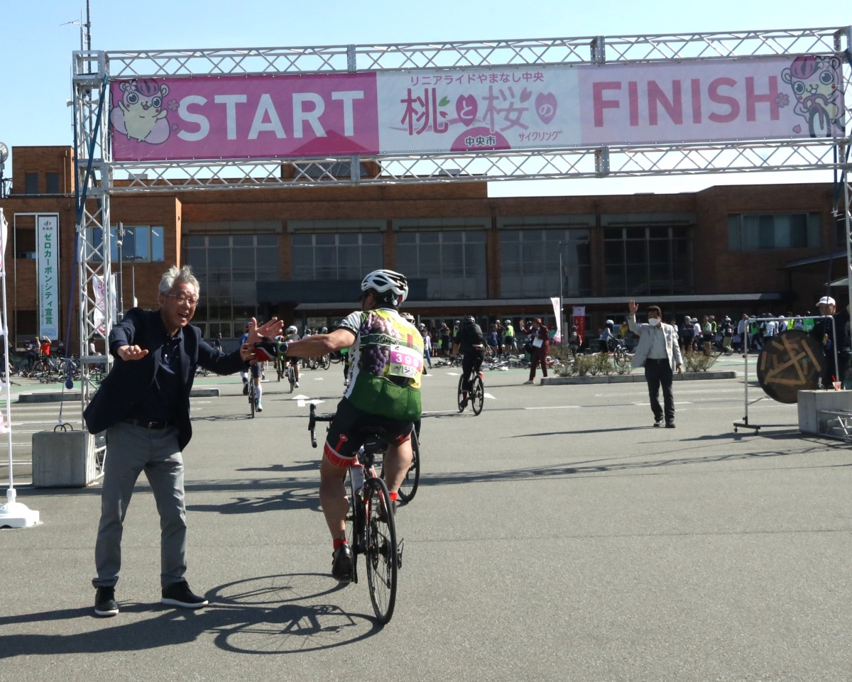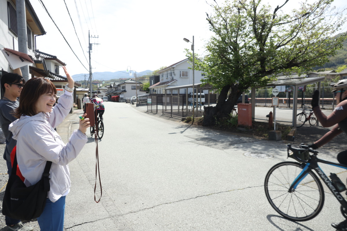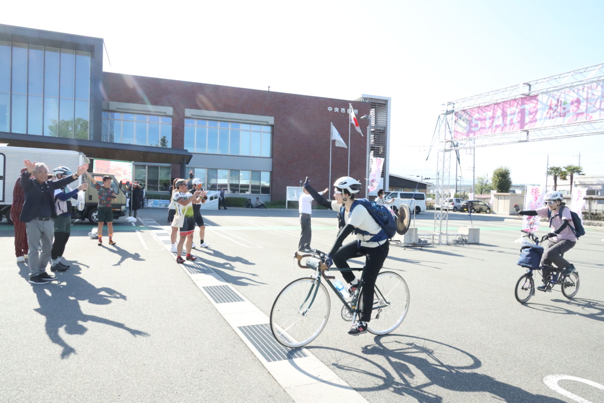 サイクルトレイン利用者は甲斐上野駅からスタート。いわば特別ルートだ。「桃と桜のサイクリング」は本来、中央市役所スタートとなるが、このサイクルトレインを使ったルートは異なる。甲斐上野駅前に用意された“0エイド”から、本編に合流する流れだ。すでにイベントの熱気は十分で、列車で一緒だった参加者はスタートからご機嫌。浅利さんに見送られながらコースを進む。