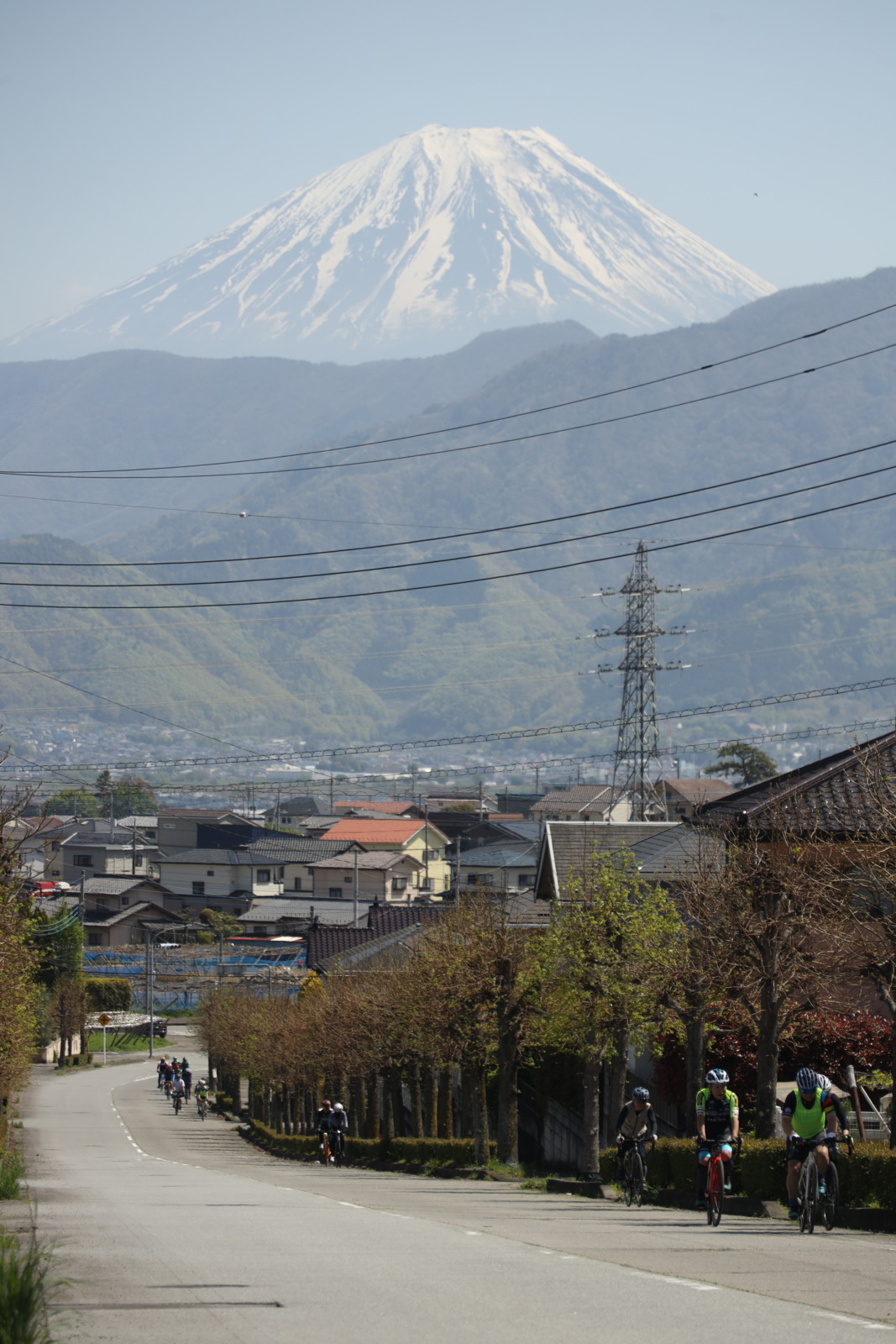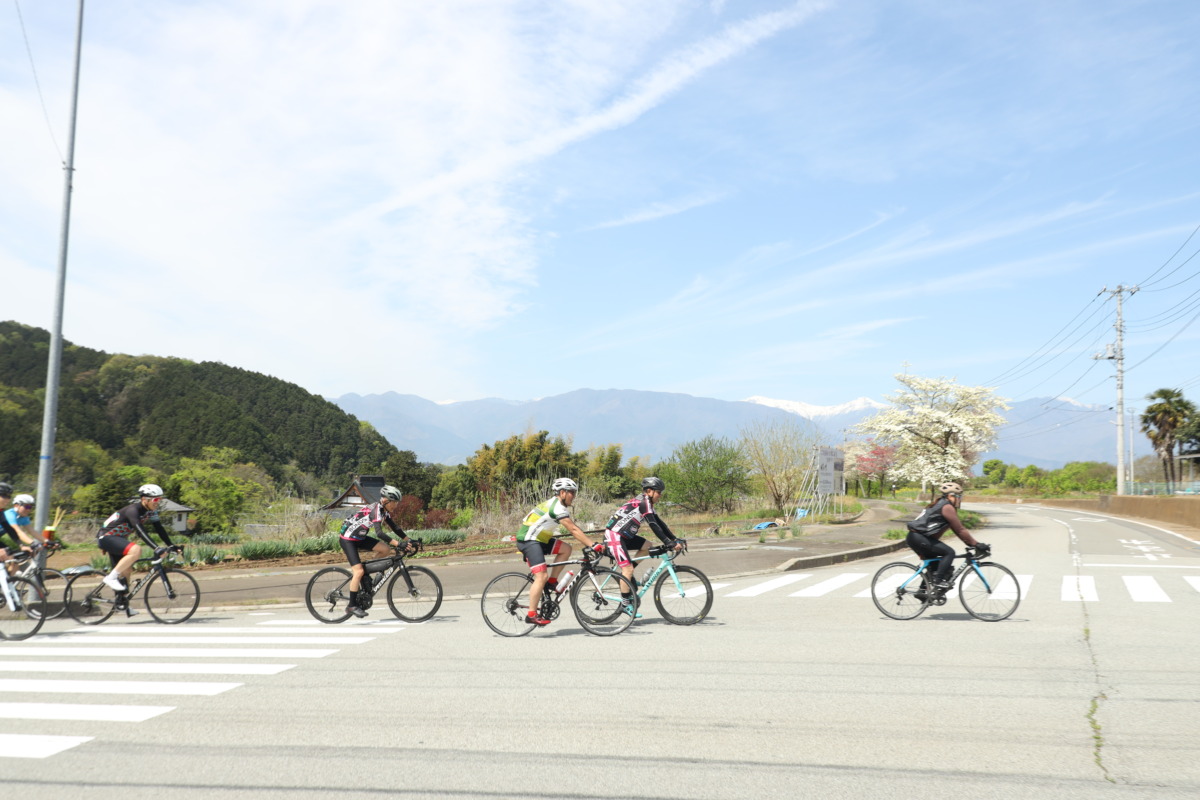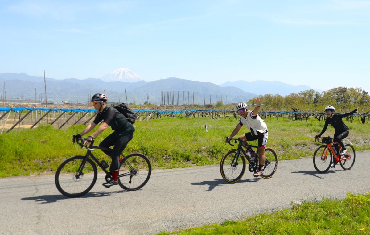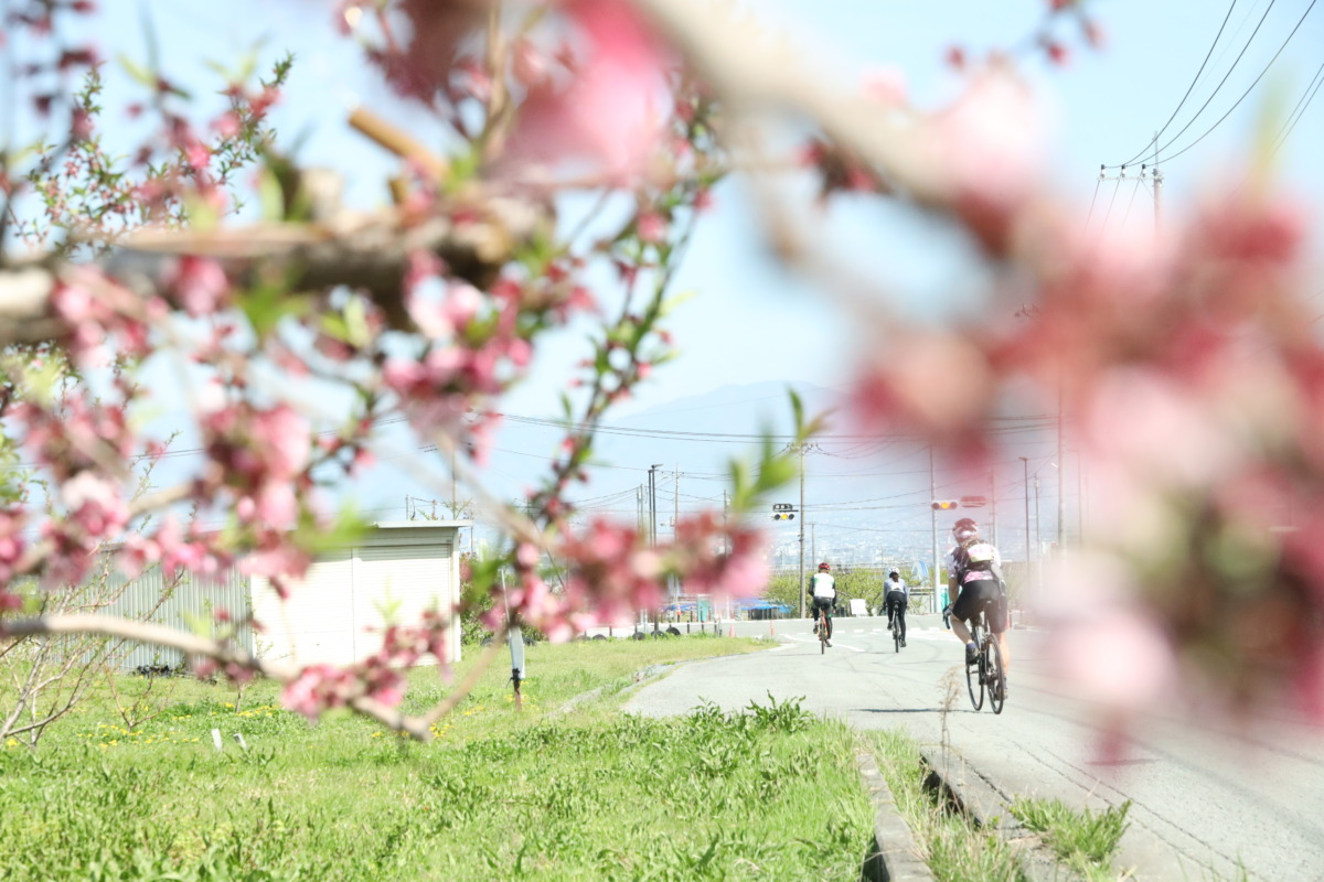 南アルプス市に入ると、沿道にはサクランボをはじめとした果樹園が広がり、どこかのどかな空気に包まれる。視線を上げると、山の影から富士山がゆっくりと姿を現しはじめ、思わずペダルを止めたくなるほどの存在感だ。春のやわらかな光の中、果樹と山岳風景が同時に楽しめるこの区間は、まさに山梨らしさを凝縮したハイライトと言えるだろう。