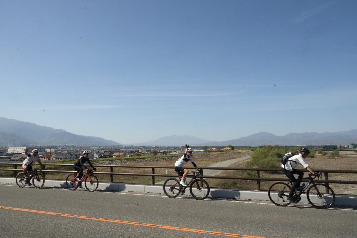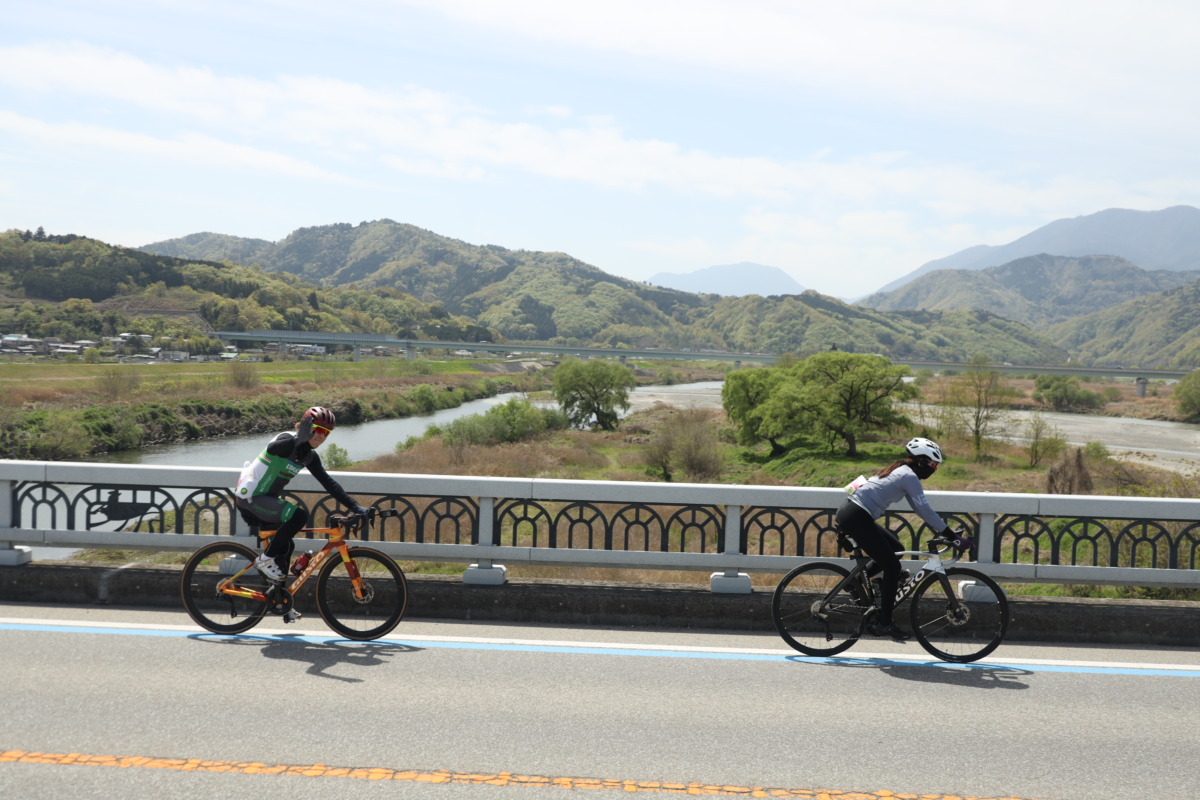 また、コースはフラット一辺倒ではなく、緩やかなアップダウンが続く“走って楽しい”設計。脚に刺激を入れつつ、景色も楽しめる絶妙なバランスだ。エース栗原さんは「ジェットコースター」と称していたが、登っては下るを繰り返しながら甲府盆地の縁を走り、道の駅「富士川」へと進んでいく。