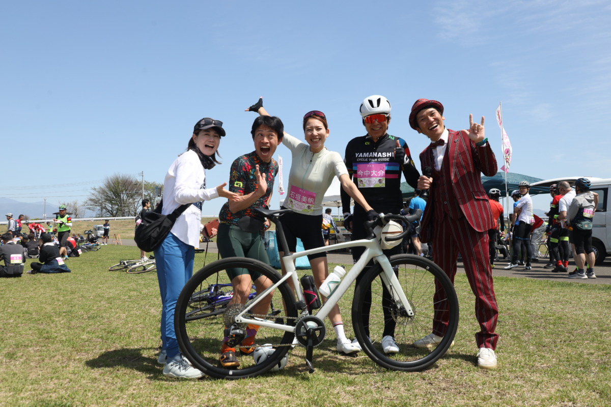 芝生の広場ではサイクリストたちが楽しく会話をしながらランチを満喫。ここでサイクルトレインチームの今中大介さん、エース栗原さんと、中央市からスタートしたゲストライダーの石垣美帆さんが合流。そしてトークで盛り上げる地元のいしいそうたろうさん、浅利そのみさんが揃った。