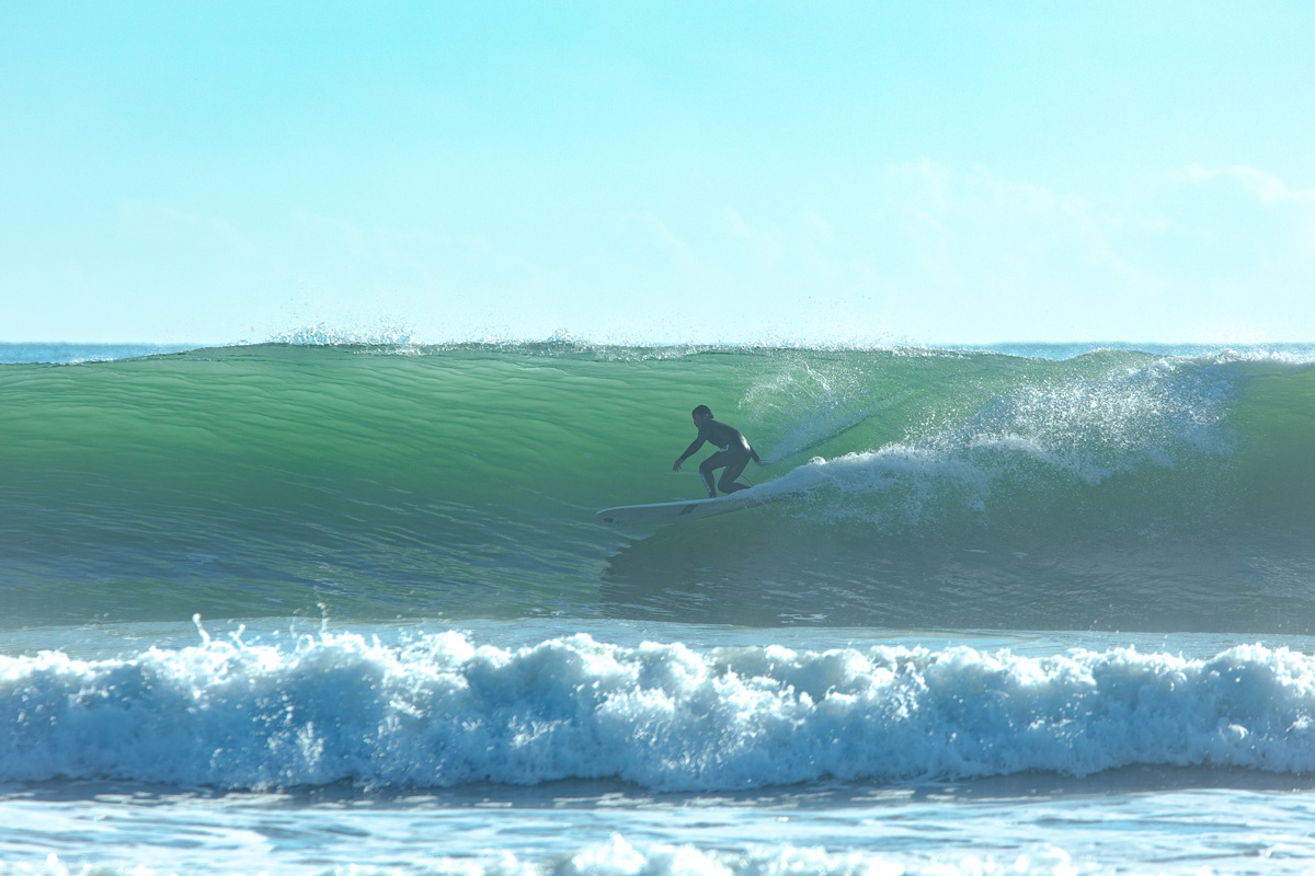 「北泉は東から南方面のうねりを拾いますが、北うねりが回り込んで入ってくるときもあります」と佐藤プロ。「ただしビーチブレイクなので、海が荒れると地形も変化します。年間を通しての特徴は、春は南岸低気圧が入れば頭ぐらいの波がブレイク。この時期は南風が多くて、面が悪くなりがちですが、気候や波の大きさを考えると、初心者も楽しみやすいシーズン。夏は朝晩が無風になることが多く、伊豆諸島周辺に台風ができると、波が反応し始め、遊べます。夏はライフセーバーもいるので、安心してサーフィンを楽しめます」