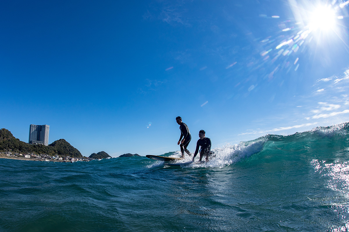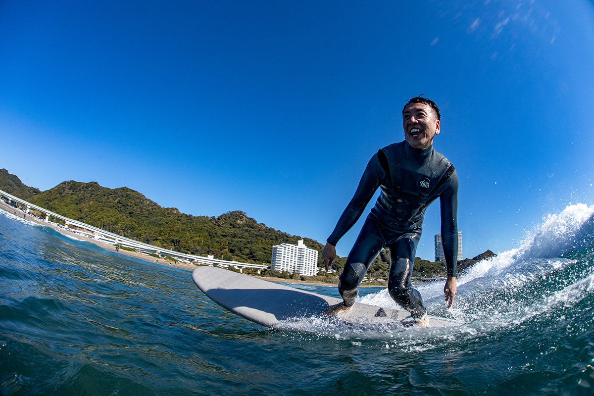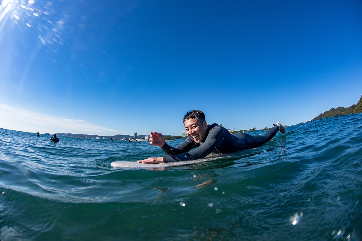 着替え後、早々に海へとパドルアウトし、波のピークを目指す。キラキラと輝く水面の上に浮かぶ笑顔は、RIP SLYMEの名曲『楽園ベイベー』のハッピーで自由な空気感をも思い出させる。あの歌詞内にはサーフィン用語も散りばめられていた。