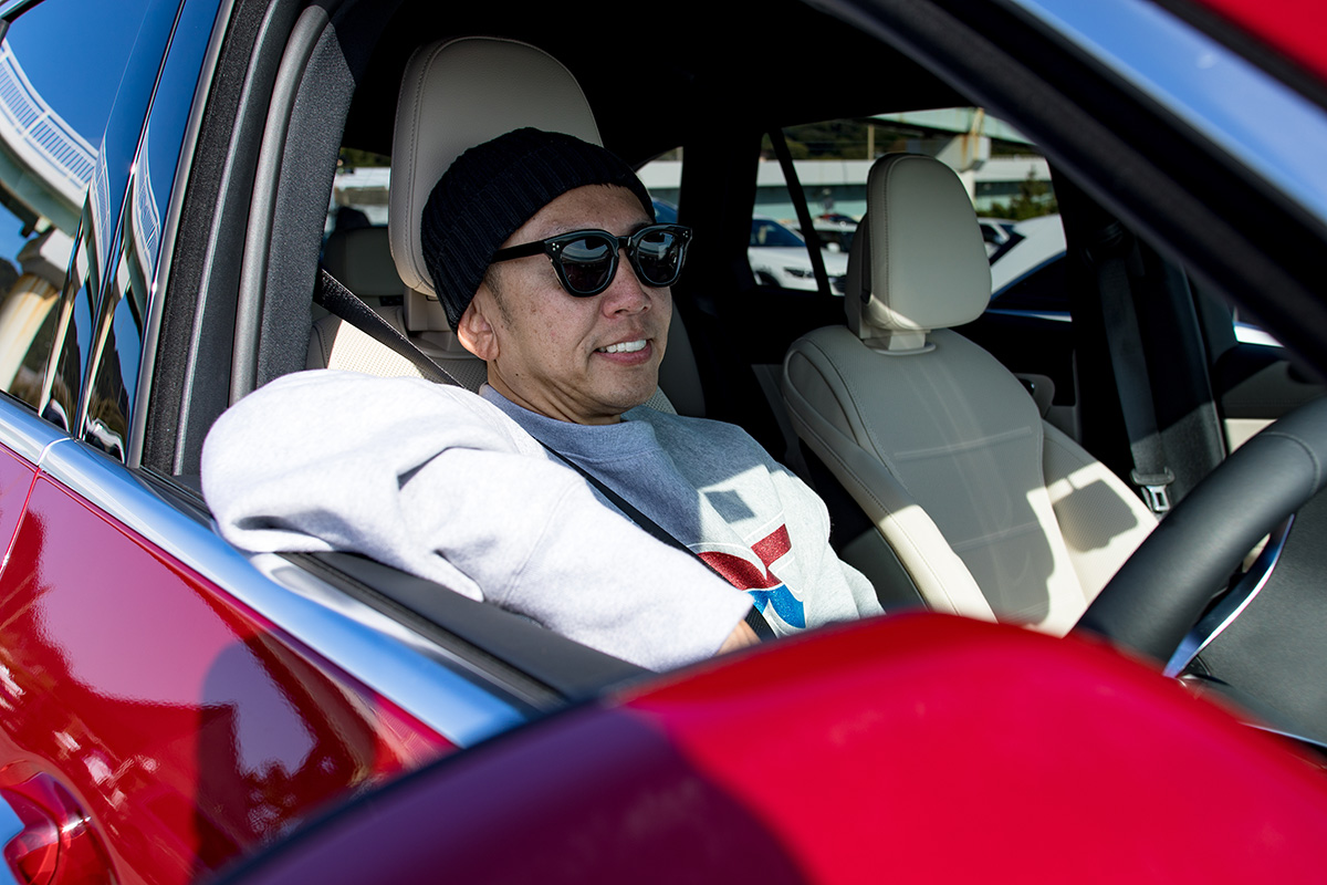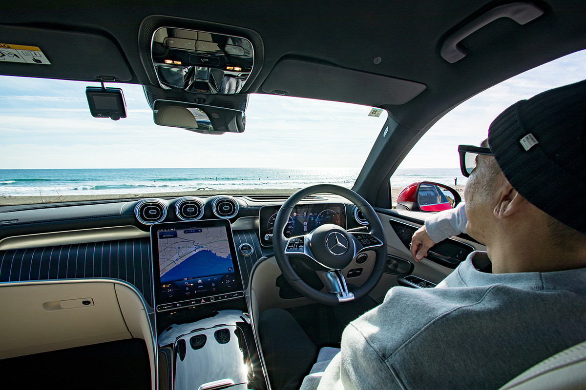 「今回GLCに乗って感じたんですが、ユーザーインターフェイスが素晴らしい。快適だし、視認性に優れている。タッチパネルを押した時、フィジカルに訴えかけてくる感触もありました。街中の低速ではハンドルがすごく軽くて扱いやすいんですよ。でもスピードが乗ってくると手応えがしっかりしてきて、走りがすごく安定する。長距離で移動する自分みたいなサーファー&ミュージシャンには、この安心感は本当にありがたいですね」