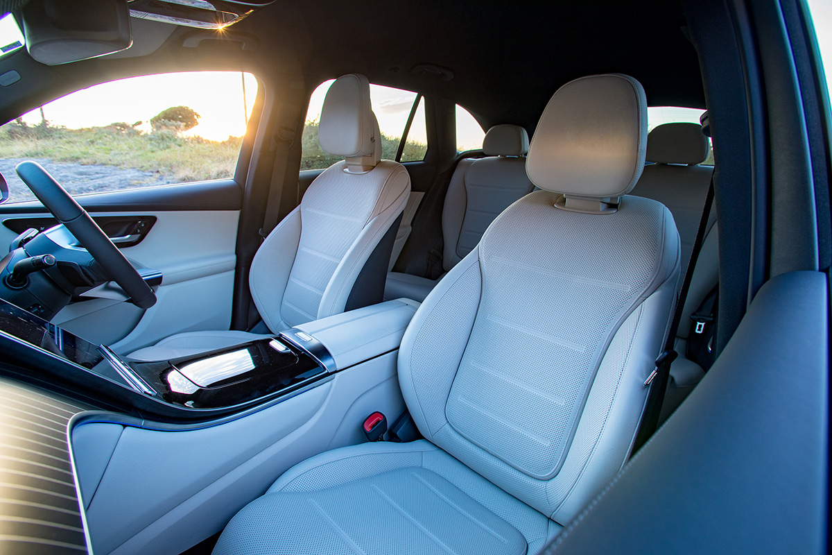 モダンで洗練されたインテリアには、冬のサーフィンに心強いシートヒーターを完備。海への足取りが軽くなるデザインと機能性には、メルセデスの最新技術が詰まっている。さらに音声アシスタントや生体認証システムなど、MBUXの直感的な操作性も魅力に。「スタート時のパワーを感じる、力強いトルクも良かったです」。