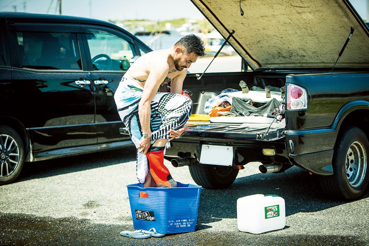 クルマに戻ったら水を浴び、ウエットスーツについた潮や砂を洗い流しておく。そしてウエットケースの中で着替えをすれば、ウエットが汚れることもなく快適。こうした工夫で、「家の風呂場が砂だらけ」という悲劇を未然に防ぐことができる。