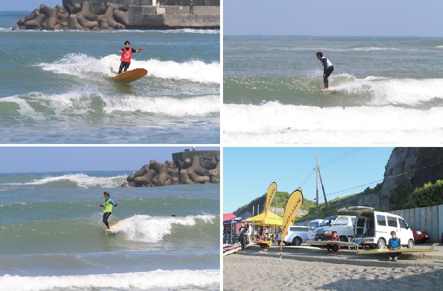 ▲(右上)太東をホームとする森大騎プロ。普段はパフォーマンス系のライディングが持ち味だが、シングルフィンでもさすがのノーズライドを披露、(右下)決勝をリラックスしたムードで待つファイナリスト、(左下)試合はメンズ・ウィメンズ混合。今回ウィメンズサーファーは3人の選手が出場し、田岡なつみプロがセミファイナルまで進んだ、(左上)クラシックスタイルのボードさばきでロングライドをメイクした吉田泰プロは、決勝で2本の5点台をスコア