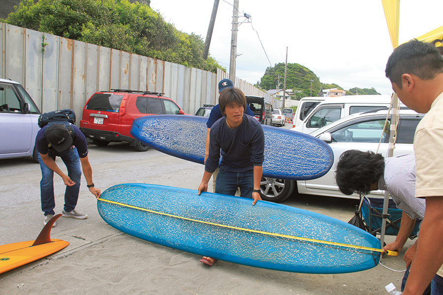 ▲使用できるボードは9’4”以上のみ。実際に長さを測り、合格したボードに大会ステッカーを貼る