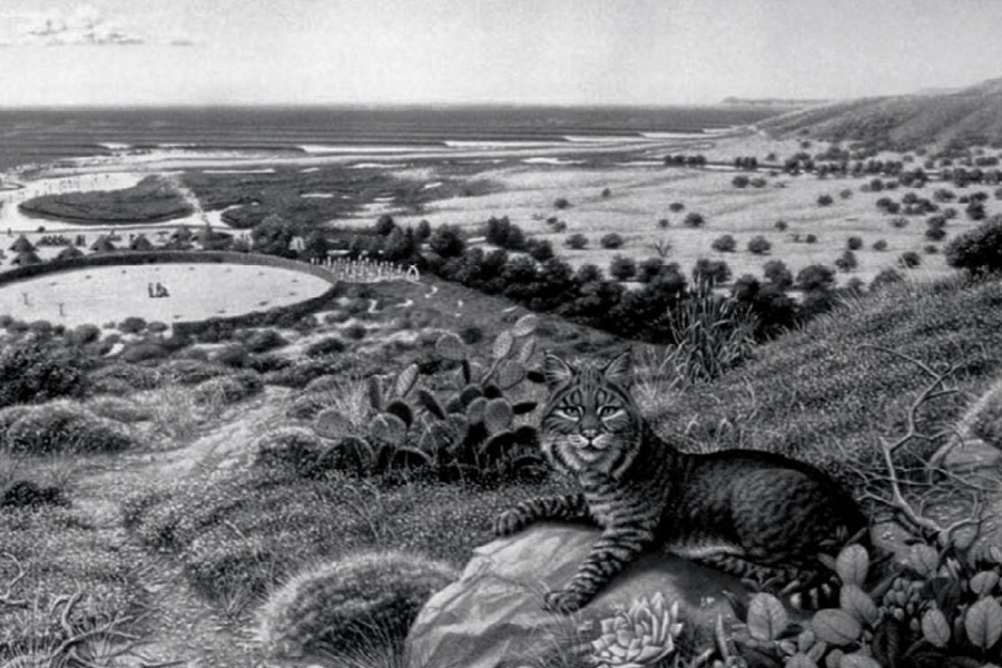 この記事のために、私はスペイン人がやって来る前のフマリウ村(現在のマリブ)を描いたリーブ・ウルパートのイラストを手に入れた。マリブクリークとラグーン、サーフライダービーチを見下ろすイラストだ。