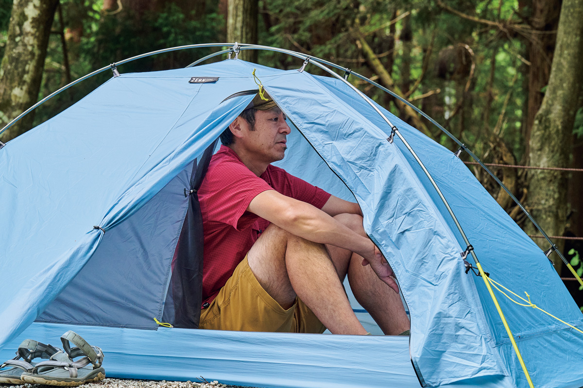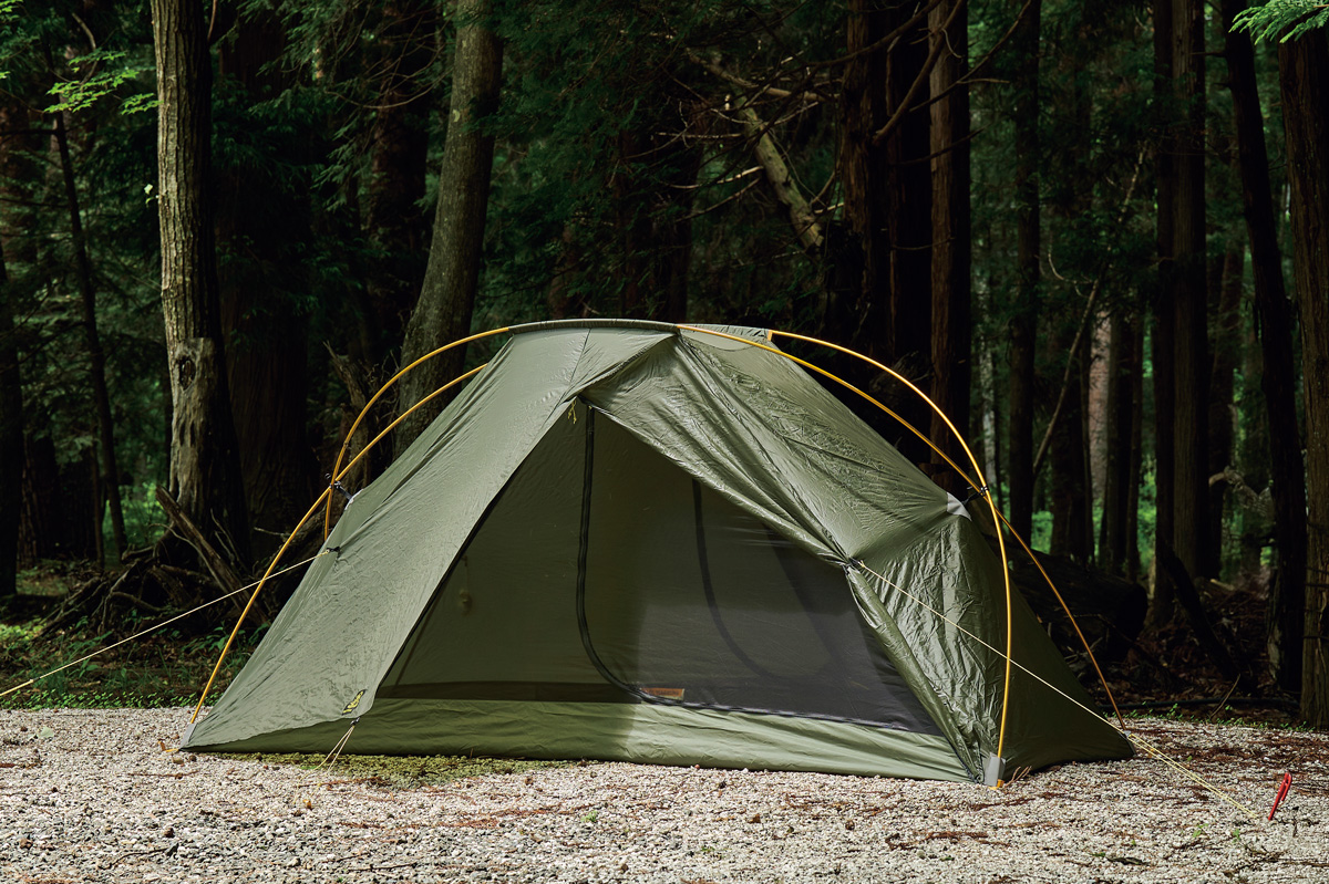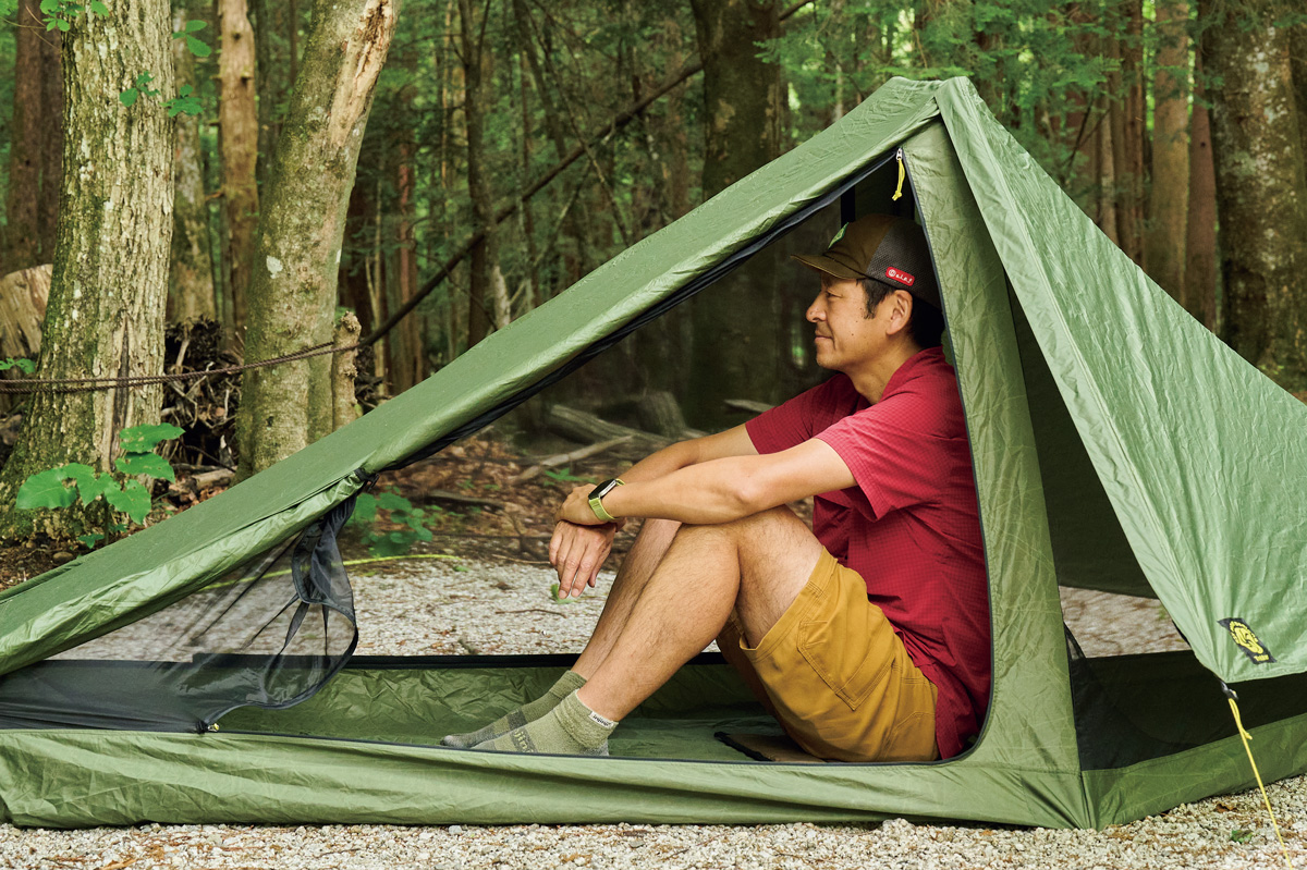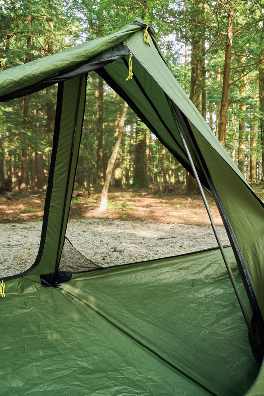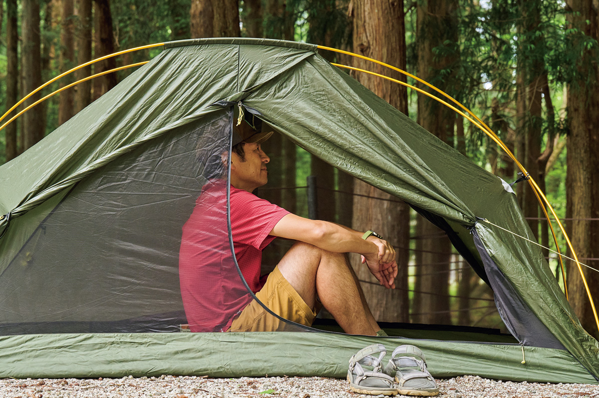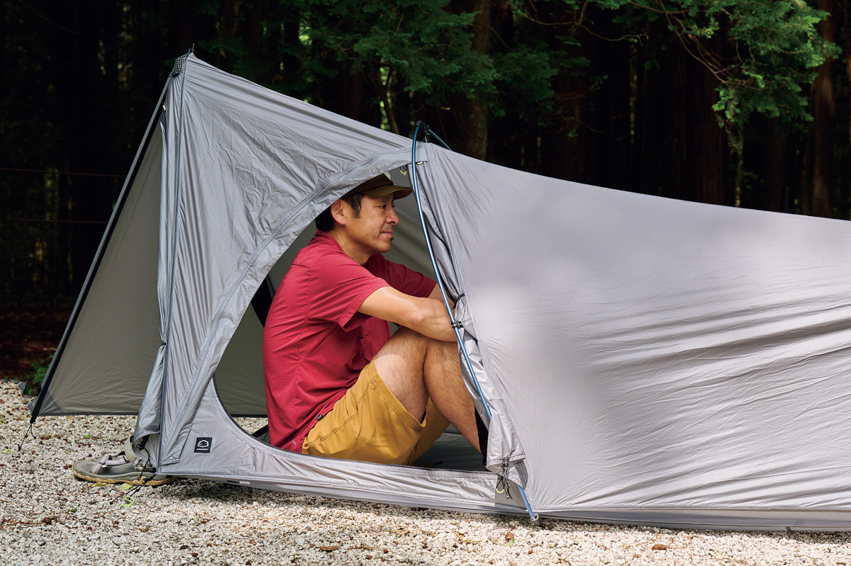 そこでわかったのは、フライがないぶん設営&撤収が素早く行なえ、安全性が高いこと。極薄軽量素材ゆえに山岳テント並の強度はない。だが使用シーンを選び、使い手の経験と技術を用いれば、軽さと快適性という相反する機能を両立させた、つくり手のアイデア、個性を最大限に楽しめるモデルということだ。