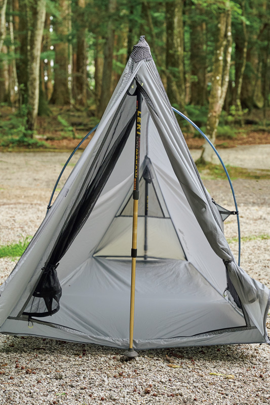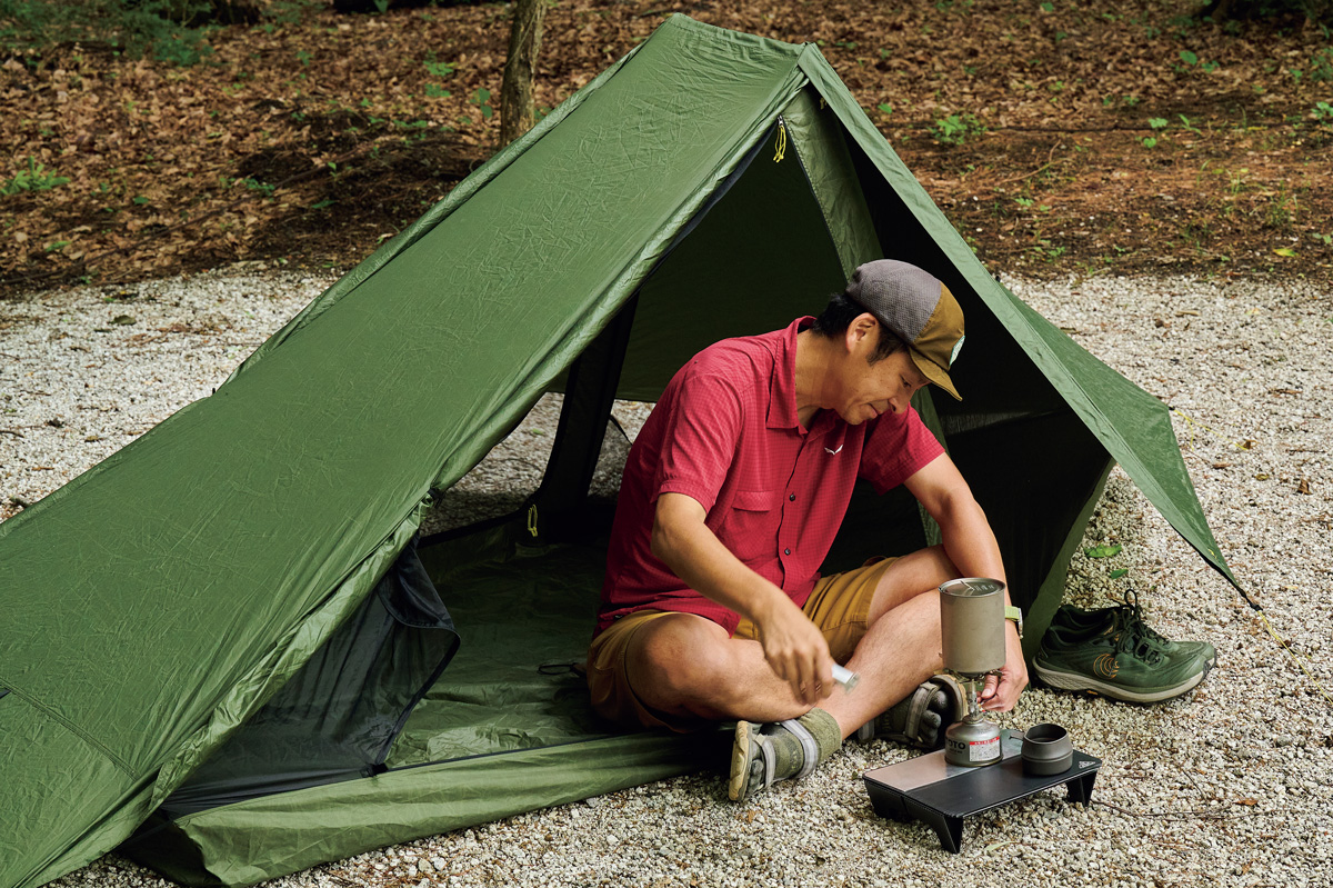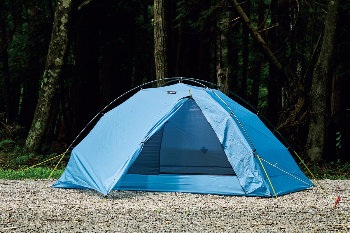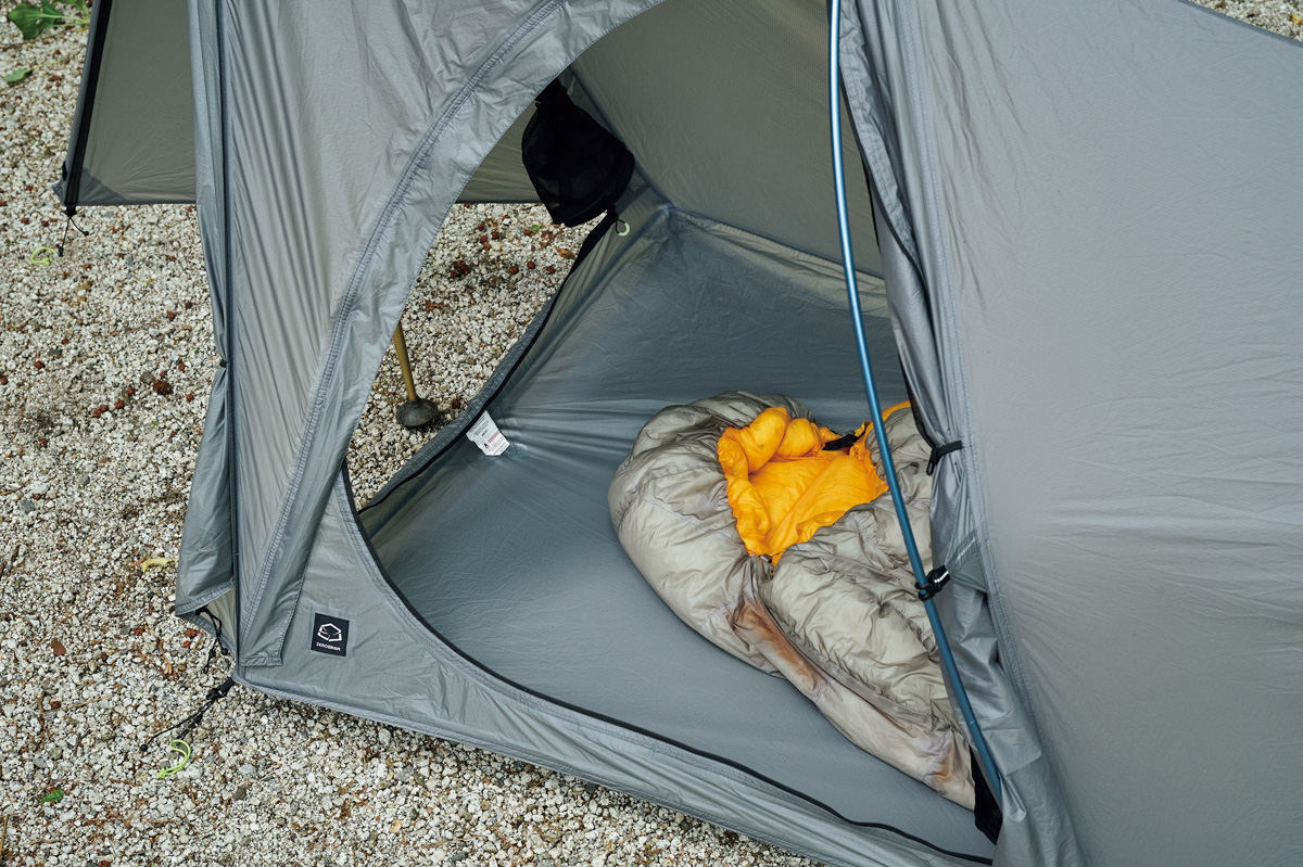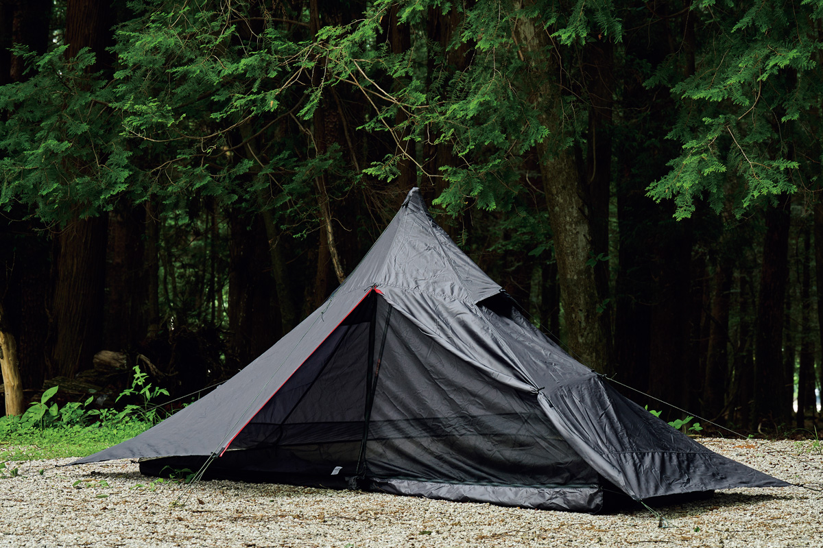 そこでわかったのは、フライがないぶん設営&撤収が素早く行なえ、安全性が高いこと。極薄軽量素材ゆえに山岳テント並の強度はない。だが使用シーンを選び、使い手の経験と技術を用いれば、軽さと快適性という相反する機能を両立させた、つくり手のアイデア、個性を最大限に楽しめるモデルということだ。