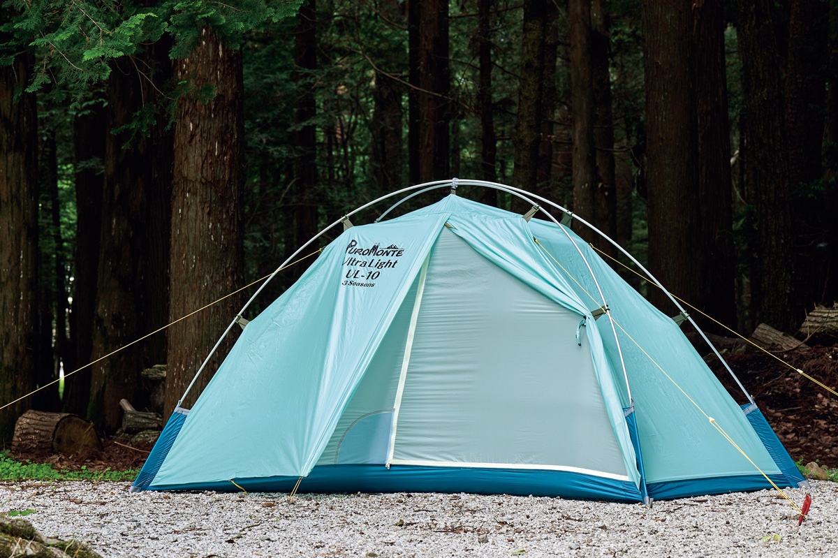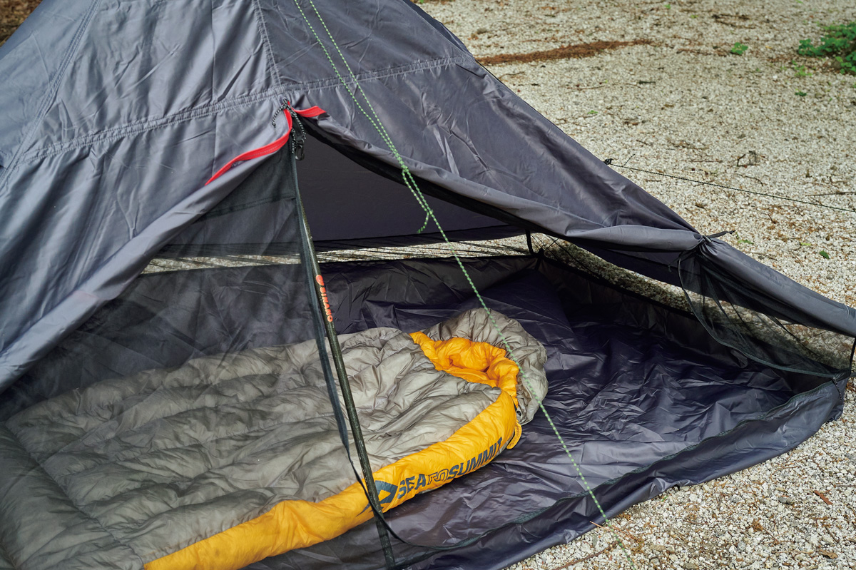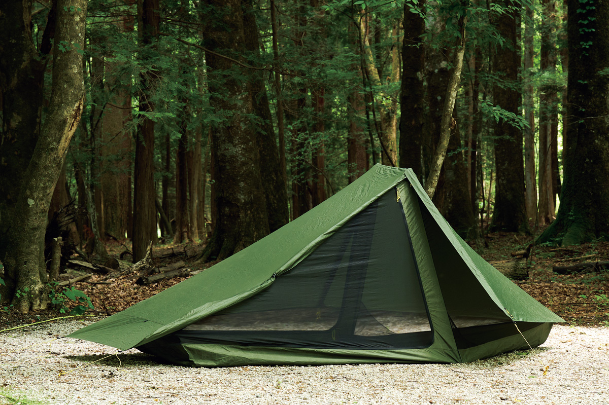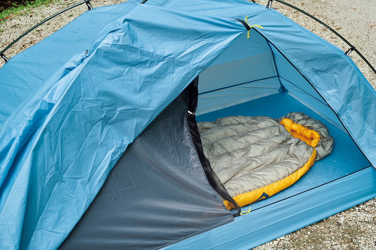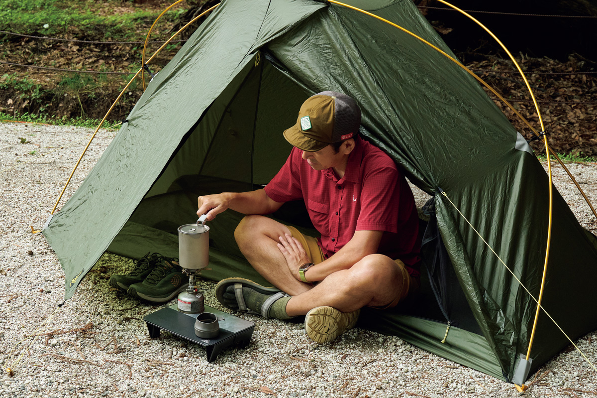 そこでわかったのは、フライがないぶん設営&撤収が素早く行なえ、安全性が高いこと。極薄軽量素材ゆえに山岳テント並の強度はない。だが使用シーンを選び、使い手の経験と技術を用いれば、軽さと快適性という相反する機能を両立させた、つくり手のアイデア、個性を最大限に楽しめるモデルということだ。