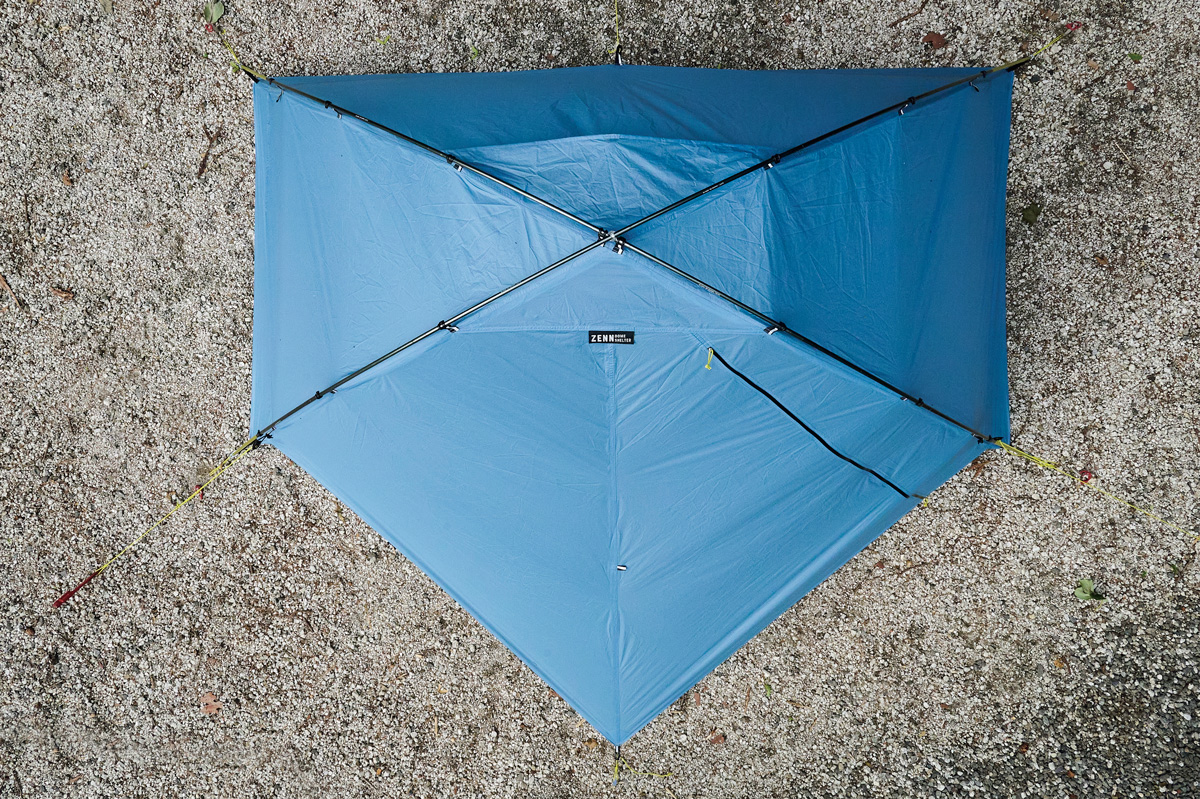 「日本の山の最適解」を追求したZENNシリーズ。奥行80cmの前室を備え、使い勝手、見た目ともにダブルウォールテント的。室内高は95cmとやや低く、身長180cm以上の人は窮屈。しかし付属のガイラインを四隅の低い位置からセットでき、わずかな低さが耐風性、軽さにも貢献。また本体長辺側から低く延びる前室形状も、風を受け流す効果がありそう。吊り下げ式で、X字に配するポールはハブ構造で連結。設営、撤収のしやすさは随一。