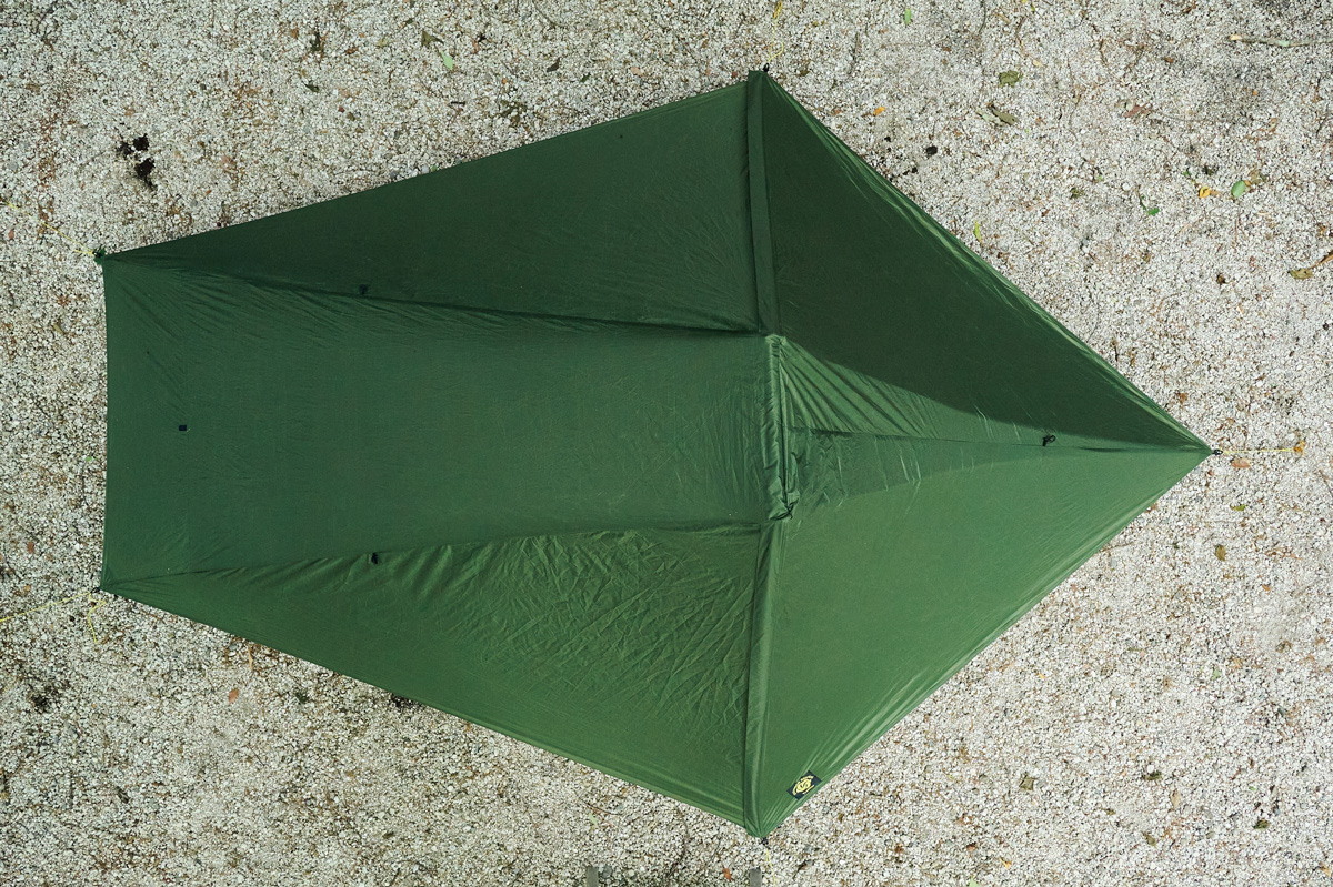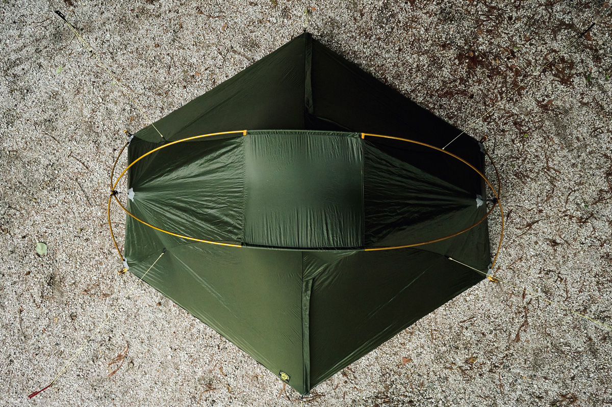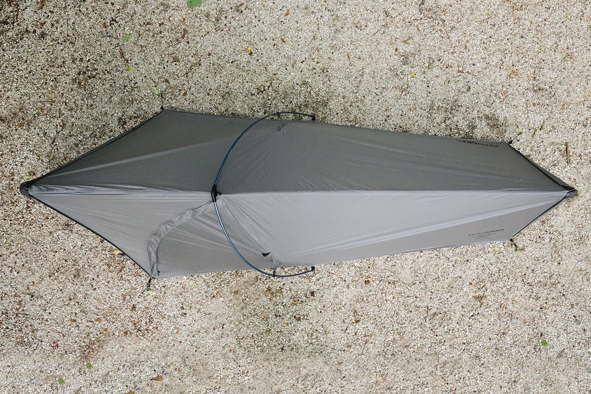 トレッキングポール2本を、長さを変えて本体前後にセットして設営。慣れが必要だが難しくはない。室内空間は十分な長さがあり、付属ポールで幅も広げられる2way仕様。だが、ペグダウンするためのスペースが大きく、混雑したテント場は不得手。傾斜した頭上部が低めで着替えは難儀する。しかしツエルトやビビィサックと思えば広く、就寝スペースに最適。頭部側の前室にゆとりがあり、頭部横に配置した出入口もおもしろい。