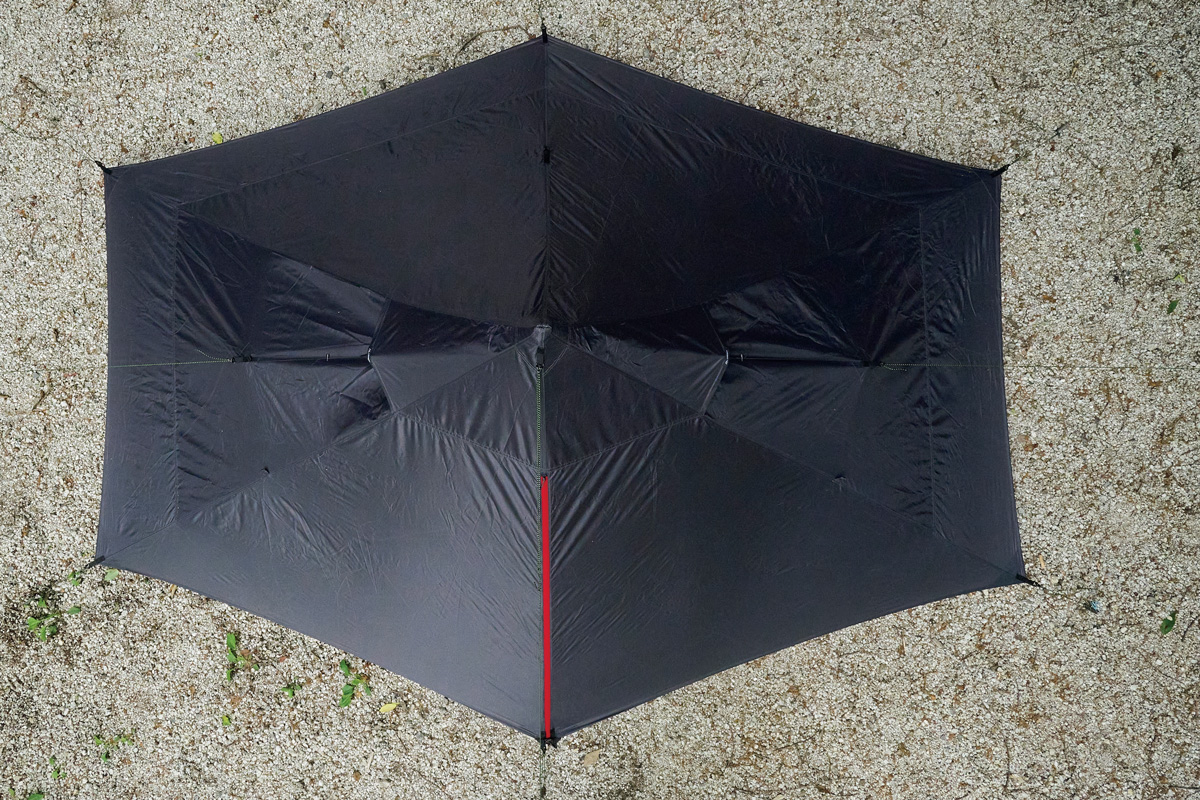 幕体をペグダウンし、1本のトレッキングポールを柱にして立ち上げて設営。驚くほど簡単に完成するシェルターのシルエットは、カテナリーカットと呼ぶ張力が均一で美しい曲線を描く。本体素材のシルポリの効果もあって、濡れてもたるみは最小限。しかし曲線を描くルーフのため、床面積は広いが、座るとやや圧迫感がある。フロアの張りも弱い。オフセットしたワンポールは出入りをじゃませず、大地に張り付く形状で風にも強い。