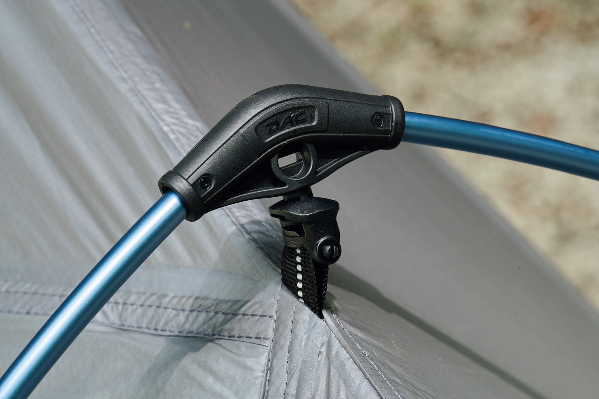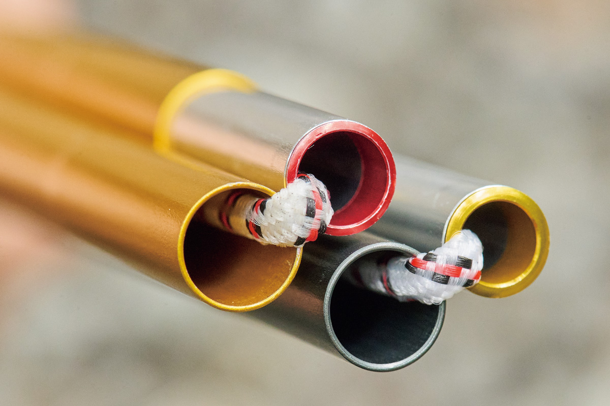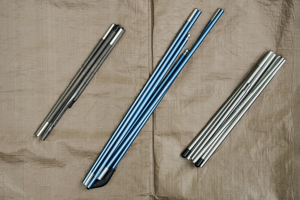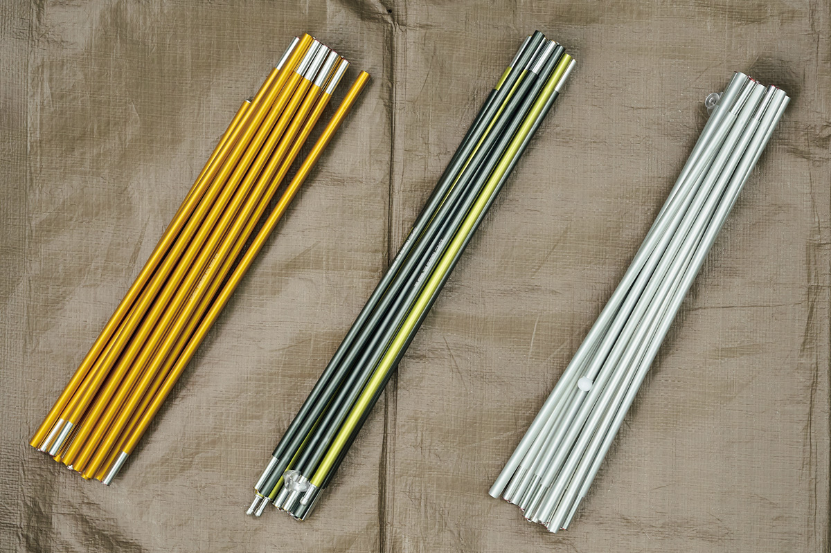 テントの強度、耐風性のベースとなるポール。昨今の自立式山岳テントに使用されるポールのほとんどは、韓国のポールメーカー「DAC社」のもの。そのDAC社のなかで、山岳テントに使用されるのは軽さと強度のバランスにすぐれたNSLと軽さを重視したNFLの2種類。今回テストしたシェルターではパーゴワークスがNSL8.5mm、自立式シックスムーンとプロモンテがNFL8.7mm。NSLのほうが細いがわずかに重い。しかしそのぶん強度がある。