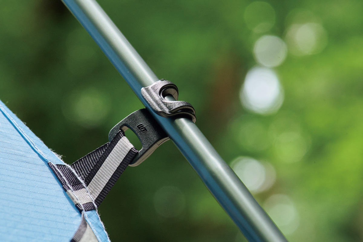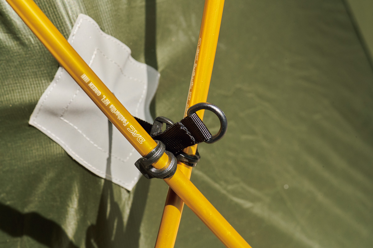 見た目は山岳テント同様。でも耐水性、強度は必要最小限で、同ブランドのなかでは自立式ツエルトという位置づけ。安定した天候が予想されるときに投入すれば、最小重量678gという軽さを武器にできる。センターハブで半固定されたX字ポールは、四隅のスリーブに通してセット。回転させて掛けるフックでポールに固定する吊り下げ式を採用。素早く設営、撤収ができ、安全。ただし軽量性に特化。テント泊の技術が必須だ。