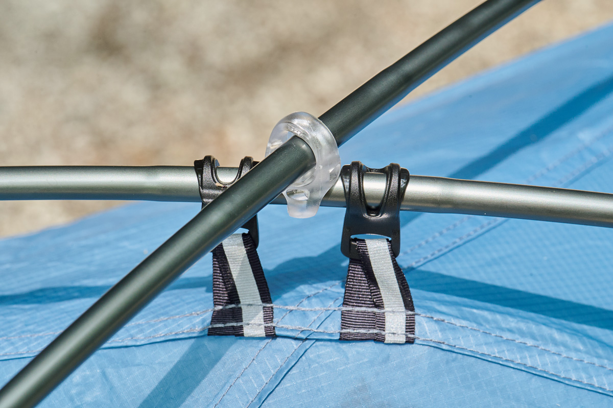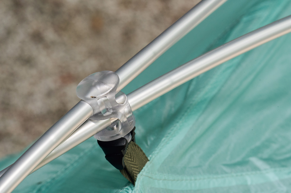 クロスポールはハブ仕様。フックも同社らしからぬシンプルさ。でもだからだれでも、簡単に素早く設営&撤収が可能になっている。
