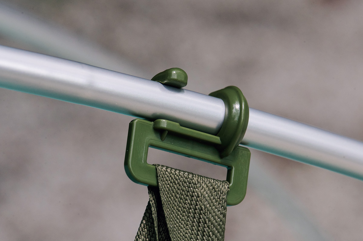 同社が長年、あらゆるテントに装備してきたセンターハブの吊り下げ、スクリュー式のフックを採用。信頼と実績、そして強度にすぐれる。