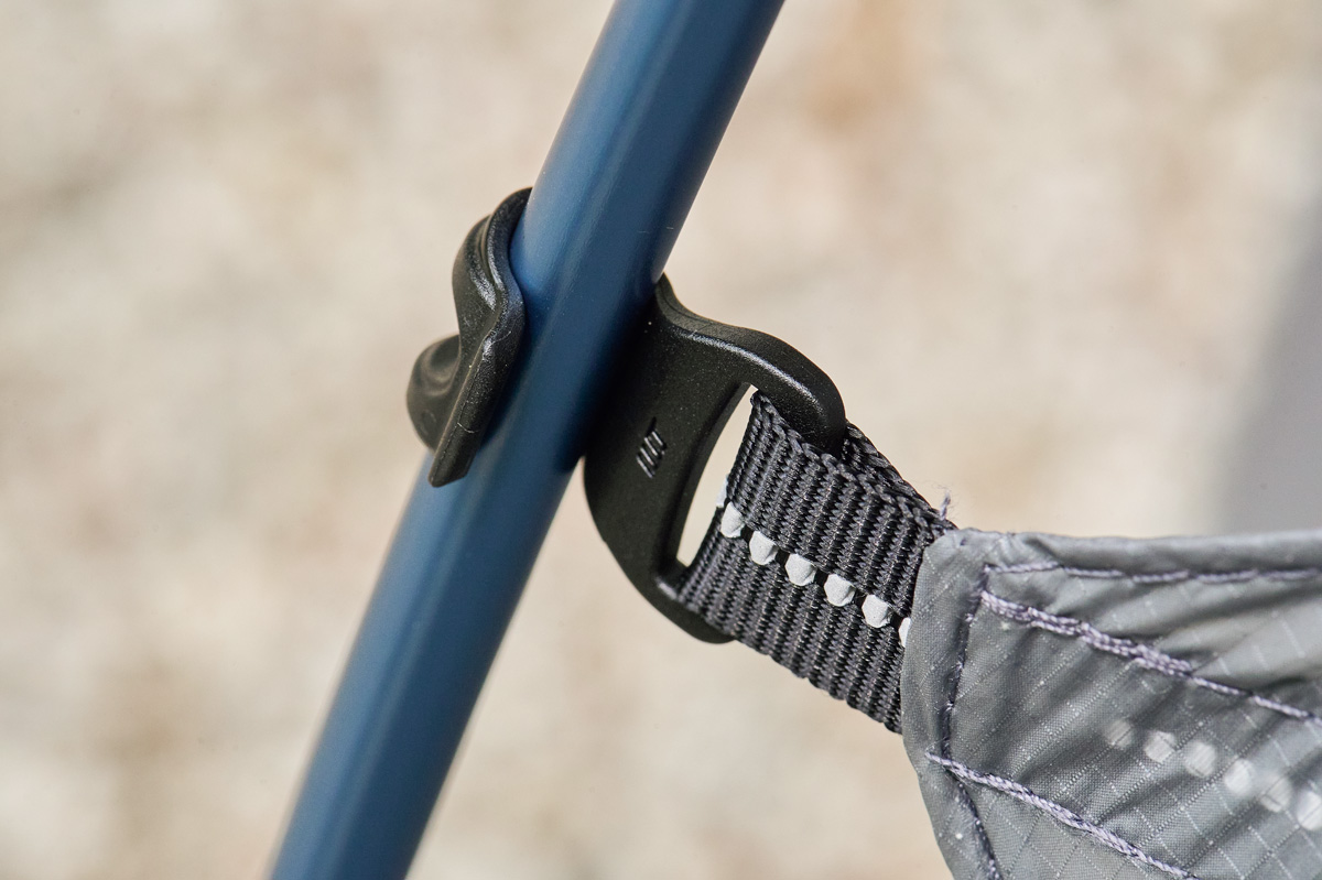 2本のポールの交点に、それぞれフックを掛ける仕様。中央のタブを引っ張るとフック2つが外れる。米国ブランドらしからぬギミック!