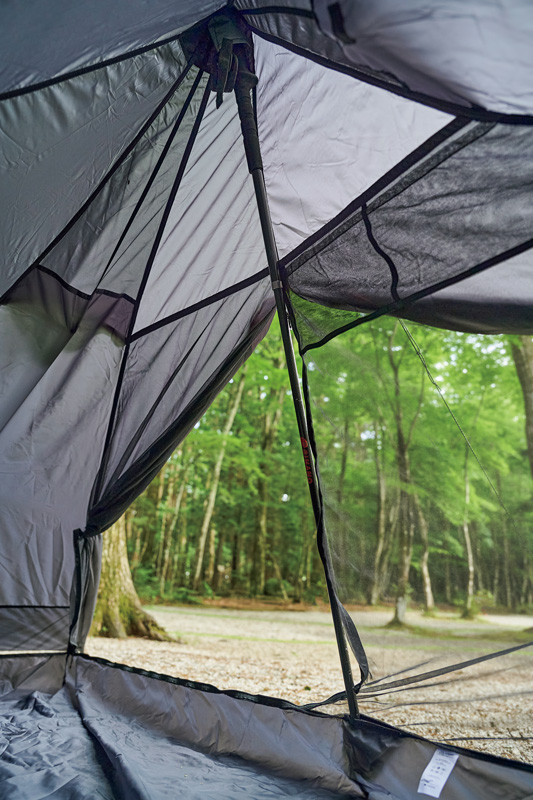 前室の効果は大きく、荷物を置いて室内を広くでき、ドロドロのシューズを室外に置けて快適。なにより本体部の開口部に装備されたメッシュ扉が大型ベンチレーションになり、前室部の空間が広がったことも加わり、結露が格段に軽減。ほぼ定番のダブルウォール同等の使い勝手、快適性を提供してくれるのだ。