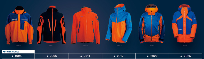 初代の登場は1995年。オレンジとブルーの配色は、この初代からすでに採用されており、現在に至るまでそれは続いている。2011年には、それまでの「マムートエクストリーム」から「アイガーエクストリーム」とシリーズ名を変更し、同時にウィメンズ展開も開始。その後も数年ごとに改良が行なわれ、2025年の今シーズン、6世代目に進化した。