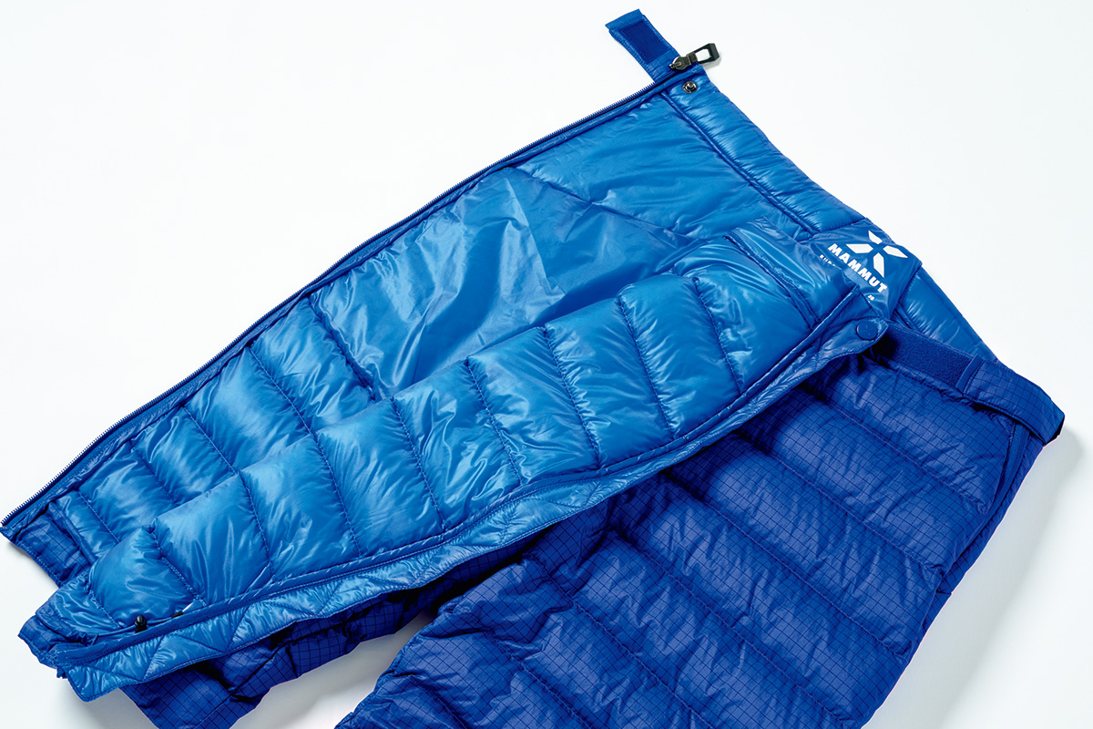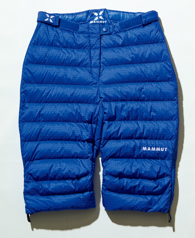 極寒環境下で下半身の保温性をプラスしたいときに役立つダウンパンツ。足さばきのモタつきを抑えるためにショーツスタイルを採用。保温が重要な腰周りと太もものみを効果的に暖めてくれる。