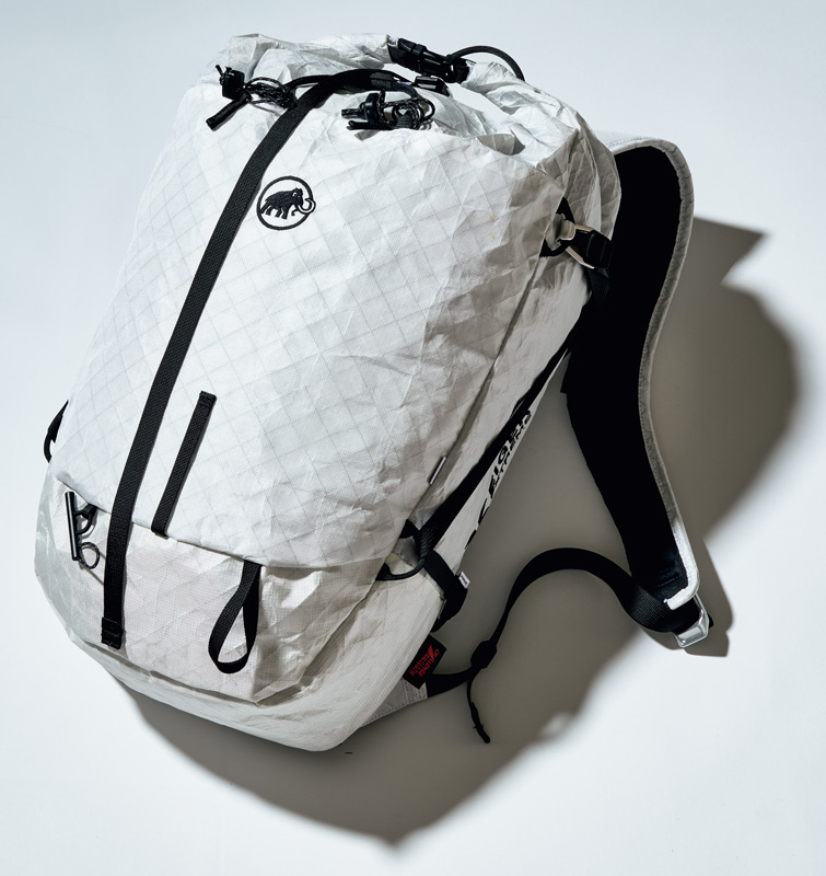 非常にシンプルかつ極めて強靱なクライミングパック。本体素材にはラミネート加工されたダイニーマが使われており、ちょっとやそっとでは破れたり壊れたりすることがない。玄人志向のパック。