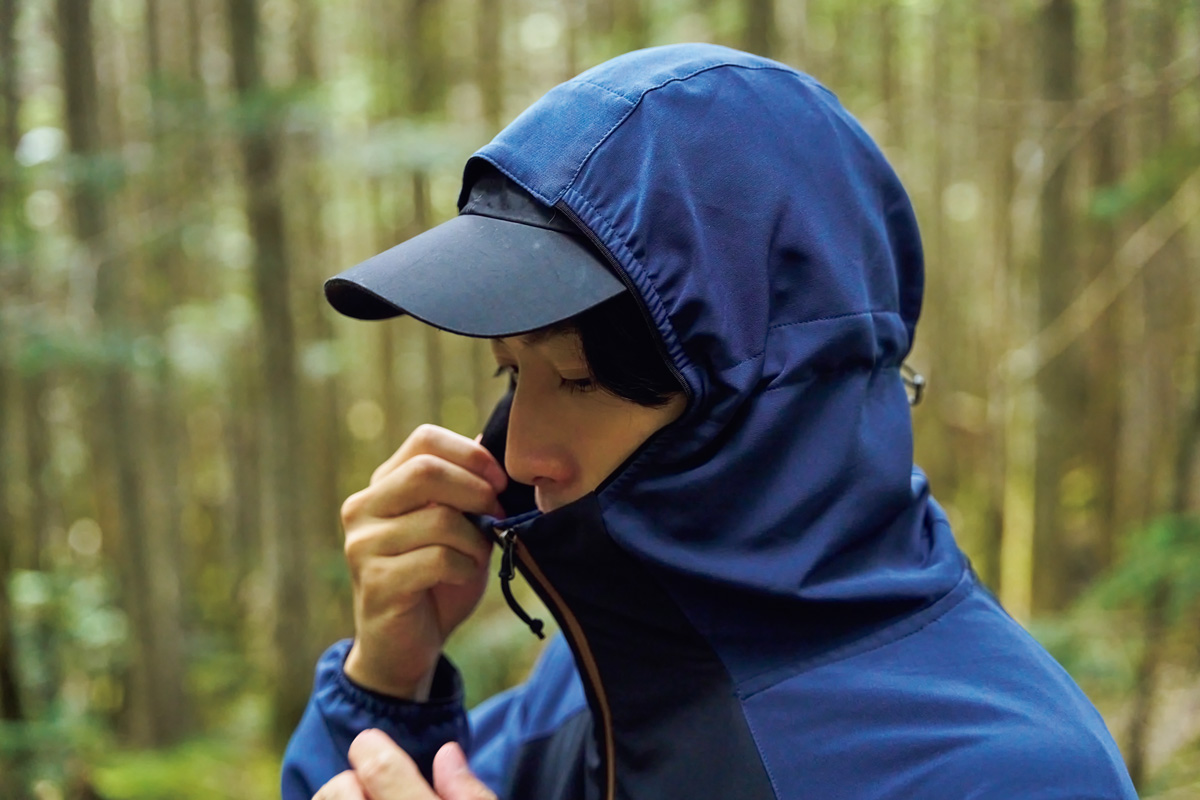 肌寒くなるこれからの季節を想定した適度な厚みのソフトシェルジャケット。フード周りと袖口、裾はシンプルなストレッチバインダー仕様で、ウエストにはファスナー付きポケットを備える。