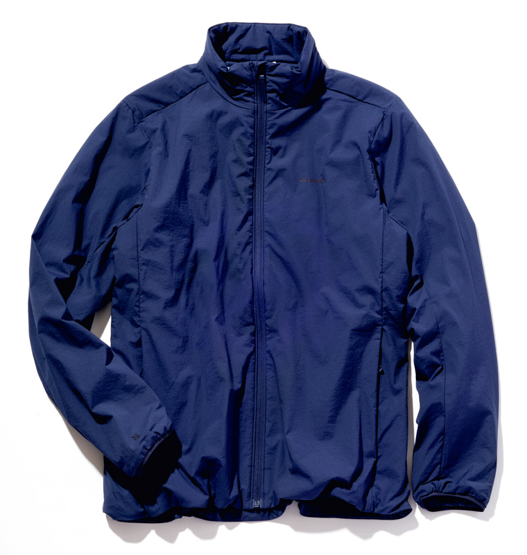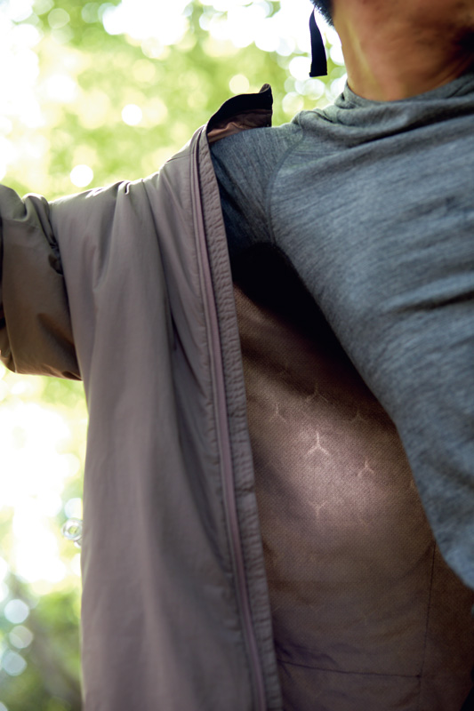 中綿には保温性とともに適度な通気性を備えるプリマロフト・アクティブを使用。さらに中綿にY字のような切れ込みが入っており、行動時は隙間が空くことで余計な熱や湿気を逃し、停滞時は切れ込みが閉じてしっかり保温してくれる。表地や裏地は伸縮性があるので動きやすく、さらに裏地はポリエステル素材なので汗を吸ってもすばやく乾く。