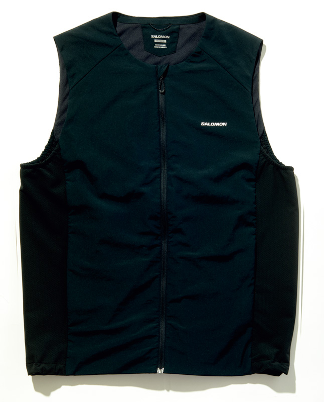 こちらも新作のハイブリッドベスト。脇の部分をニット素材で切り返しており通気性に優れ、動きやすい。襟がないので重ね着がしやすく、幅広いシーズンのレイヤリングで重宝。ファスナーを全開にしたままでも脱げにくいように、胸元がスナップボタンで留められるようになっている。