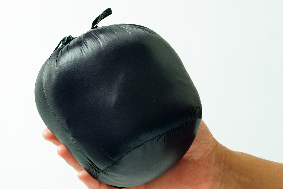 製品ボリュームからは想像できないほどコンパクトな収納サイズ。とり出せばすぐにロフトを回復させて保温力を発揮する。