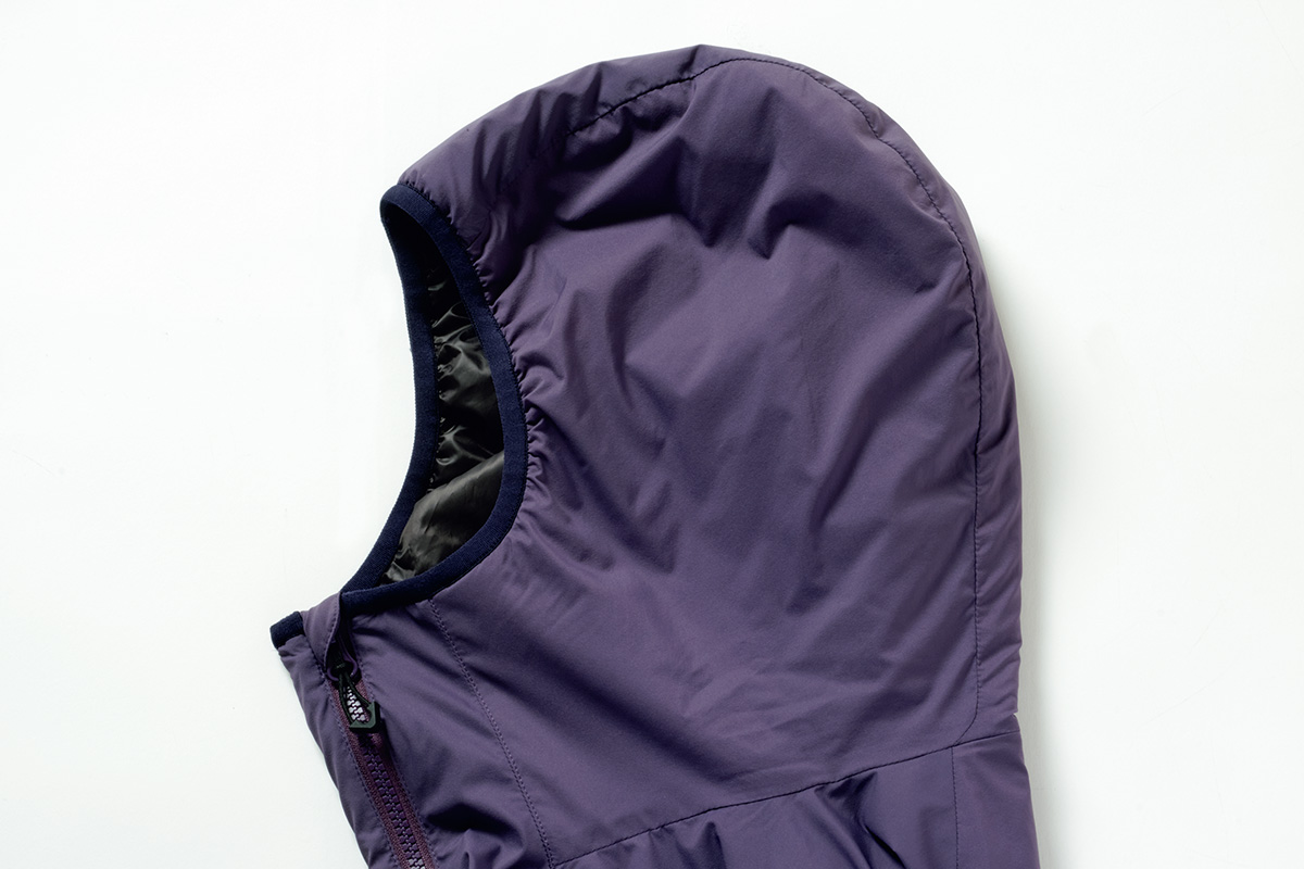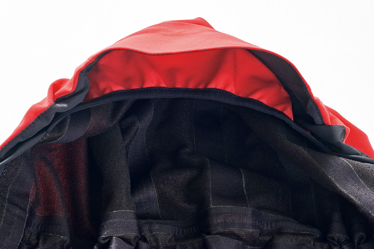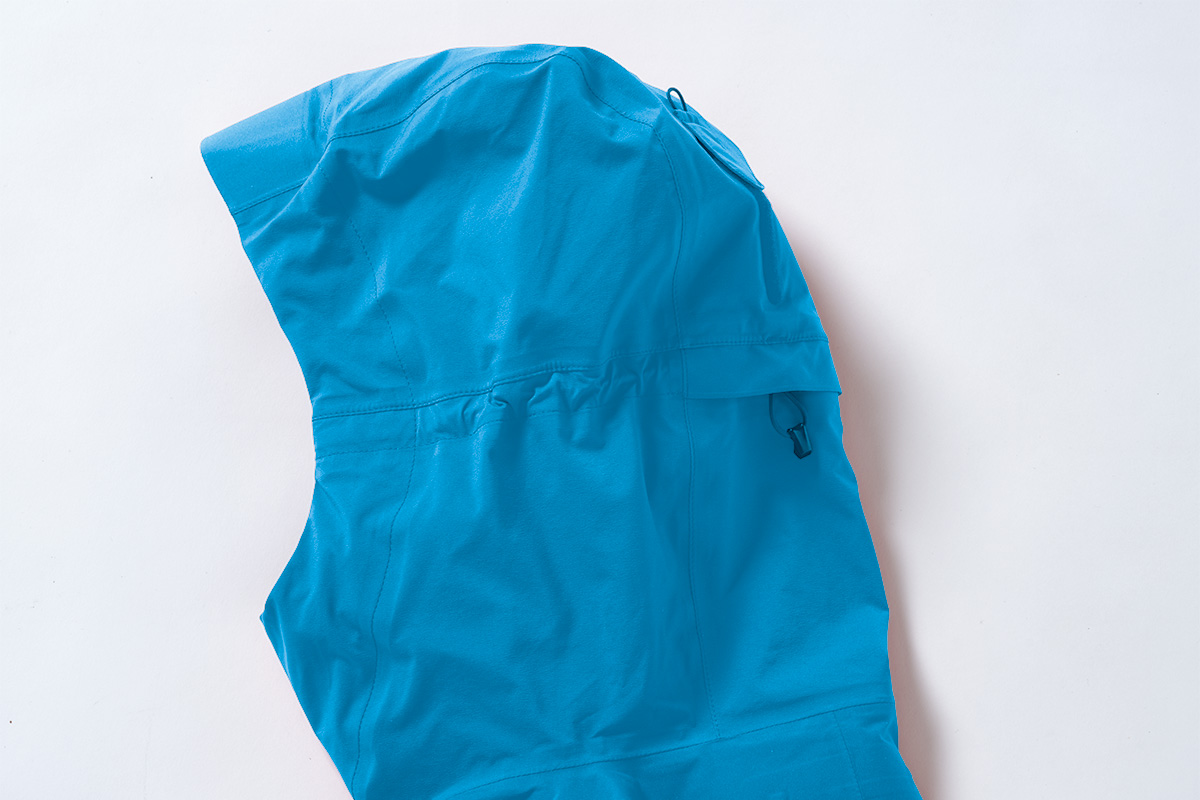 ▲ヘルメット着用に対応する大型のフード。インナーカフでフィットして頭部の動きに追従する。
