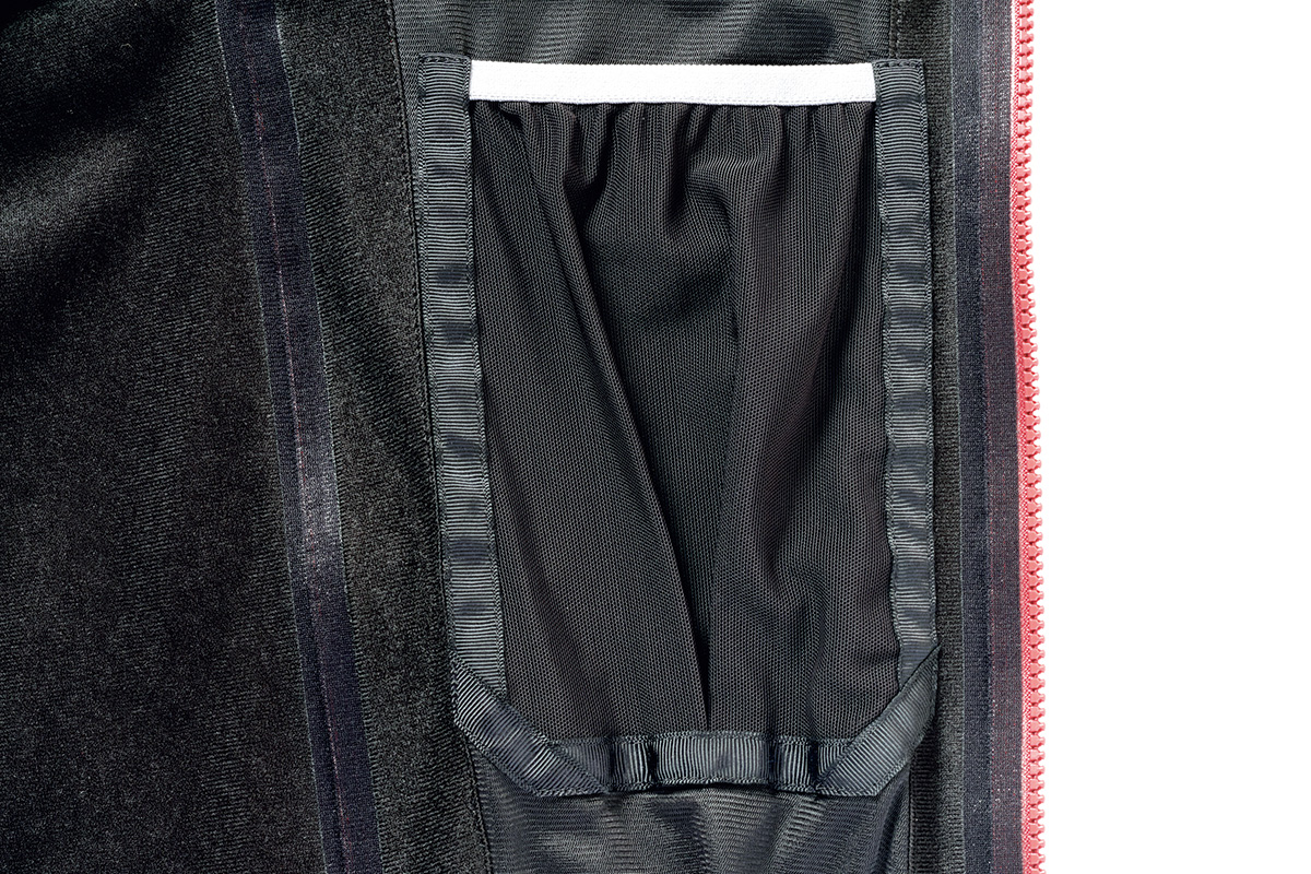▲左胸の内側には薄手のグローブなどが入るメッシュポケット。体温で温めて凍結するのを防ぐ。