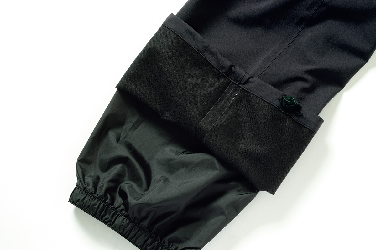 ジャケットと同素材を使用したオーバーパンツ。生地のストレッチ性に加え、膝をやや開いた3Dのアーチシルエットを採用し、トレッキングパンツに重ねて穿いたときにも動きやすい。単体で使える「ティフォンウォームネクストストレッチトレックパンツ」もある。