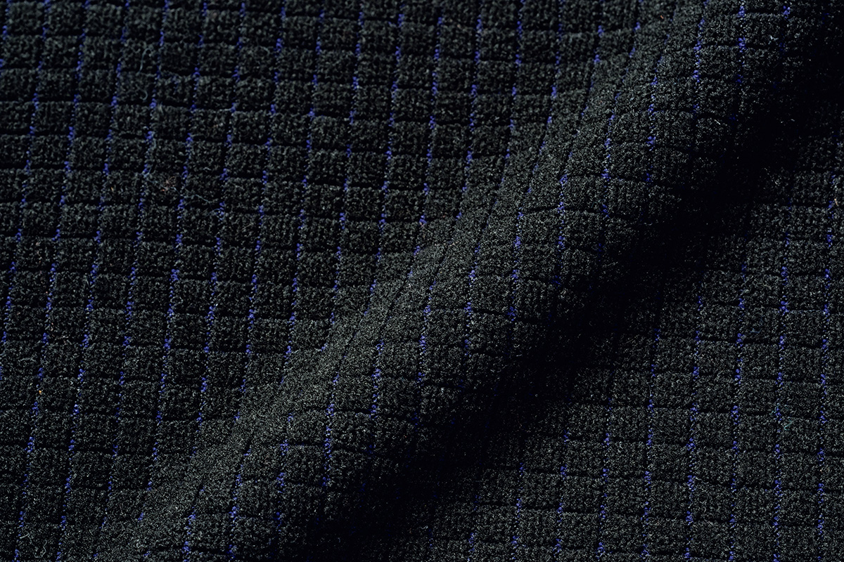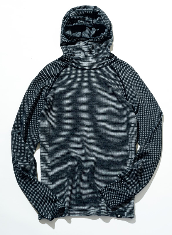 天然の保温性、調湿性、防臭性を備えるメリノウールに化繊を加えて速乾性や耐久性を高めたワッフル生地。部位ごとに編み方を変えて通気性や伸縮性を最適化している。ブラックのほか、今季はホワイトが登場。クルーやタイツ、フェイスマスクやビーニーもある。