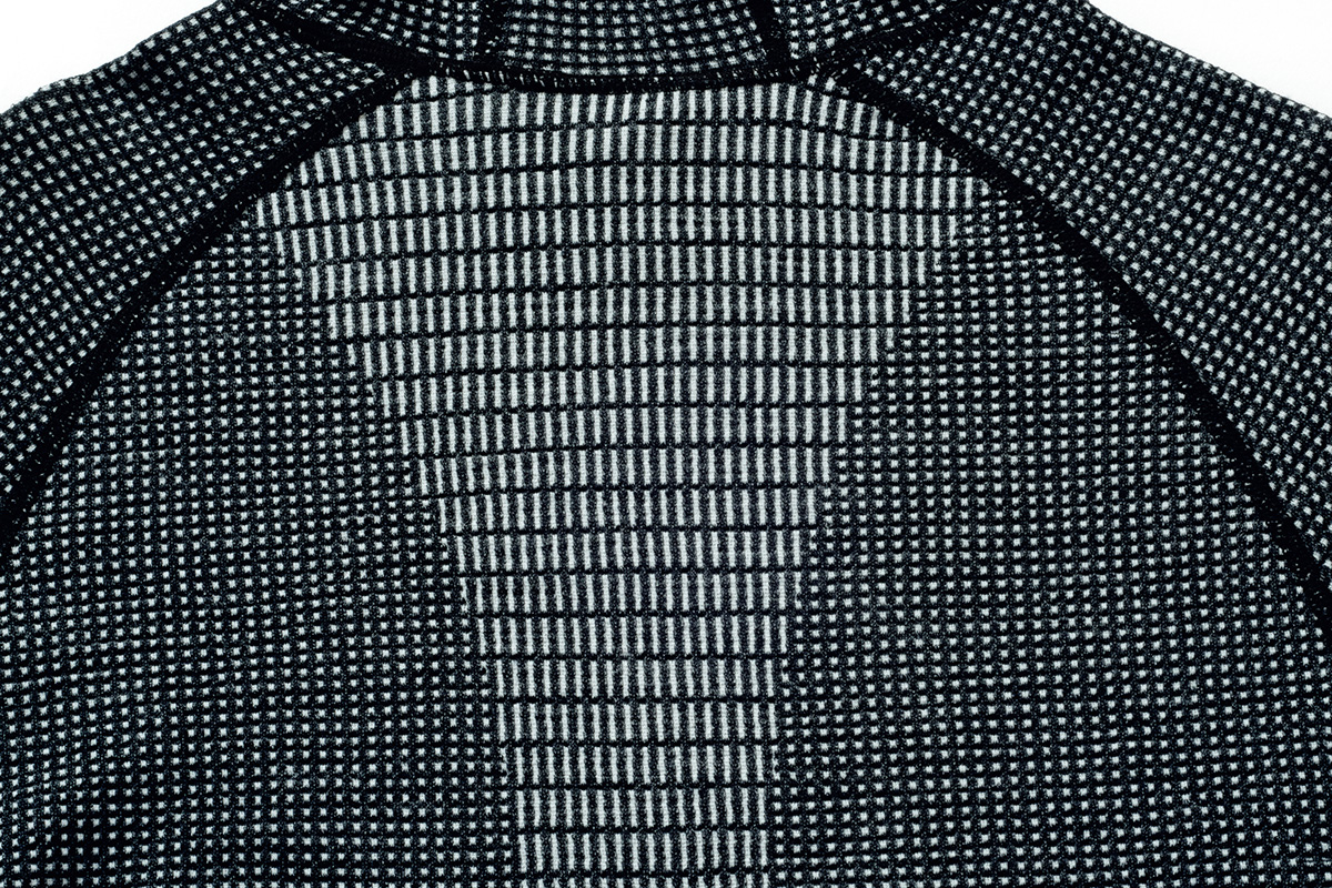 ▲コンピューター編みのホールガーメント。背中や脇などは編み方を変えて通気性を高めている。