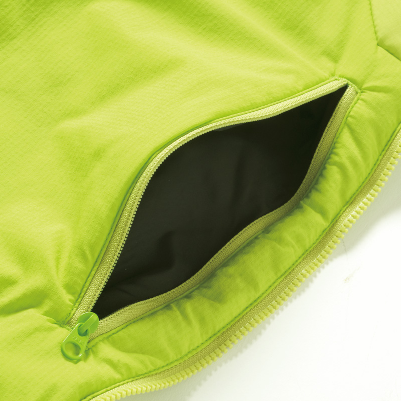 ▲防風性と撥水性を備える表地。適度に風を防いで中綿の保温力を最大限に引き出している。