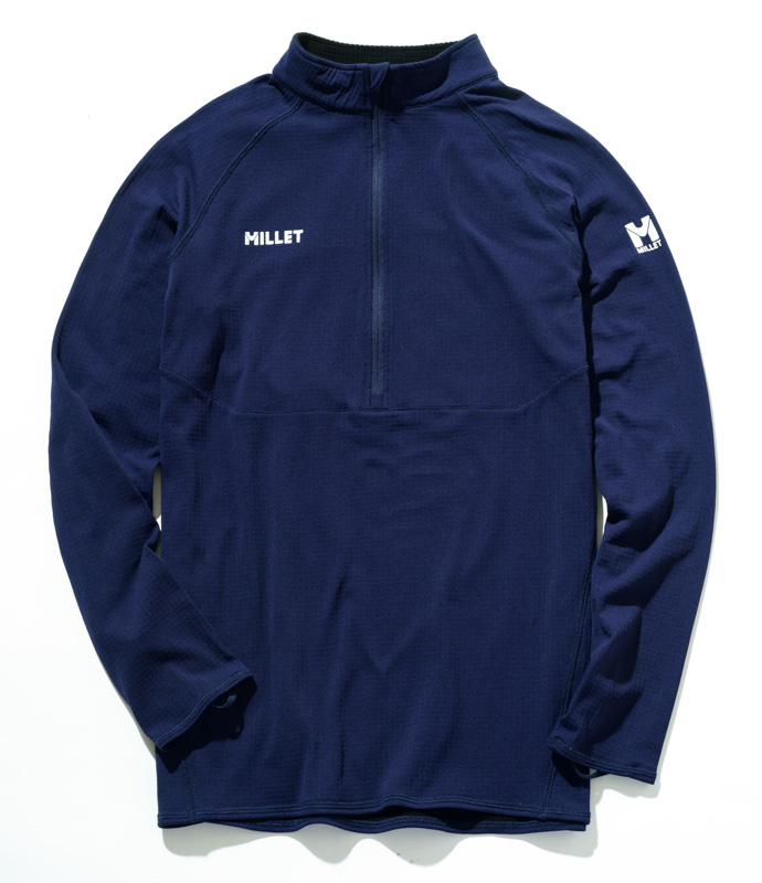 水分を一切含まないポリプロピレンを肌側に配し、外側のポリエステルで汗を吸い上げて拡散・蒸発する。今季は、素材の持ち味を生かすハーフジップが登場。4種類のなかではもっとも汗処理能力が高く、単体での使用も可能だ。ほかにフーディとクルーがある。