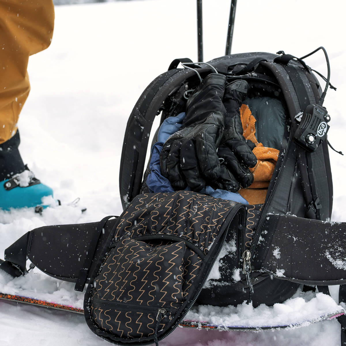 38Lの絶妙なサイズ感に、ショベルやプローブなどをスマートに収納できるアバランチツールコンパートメントを備え、メイン気室にはバックパネルアクセス。パックに詰めた荷物の整理も出し入れも超スムーズだ。