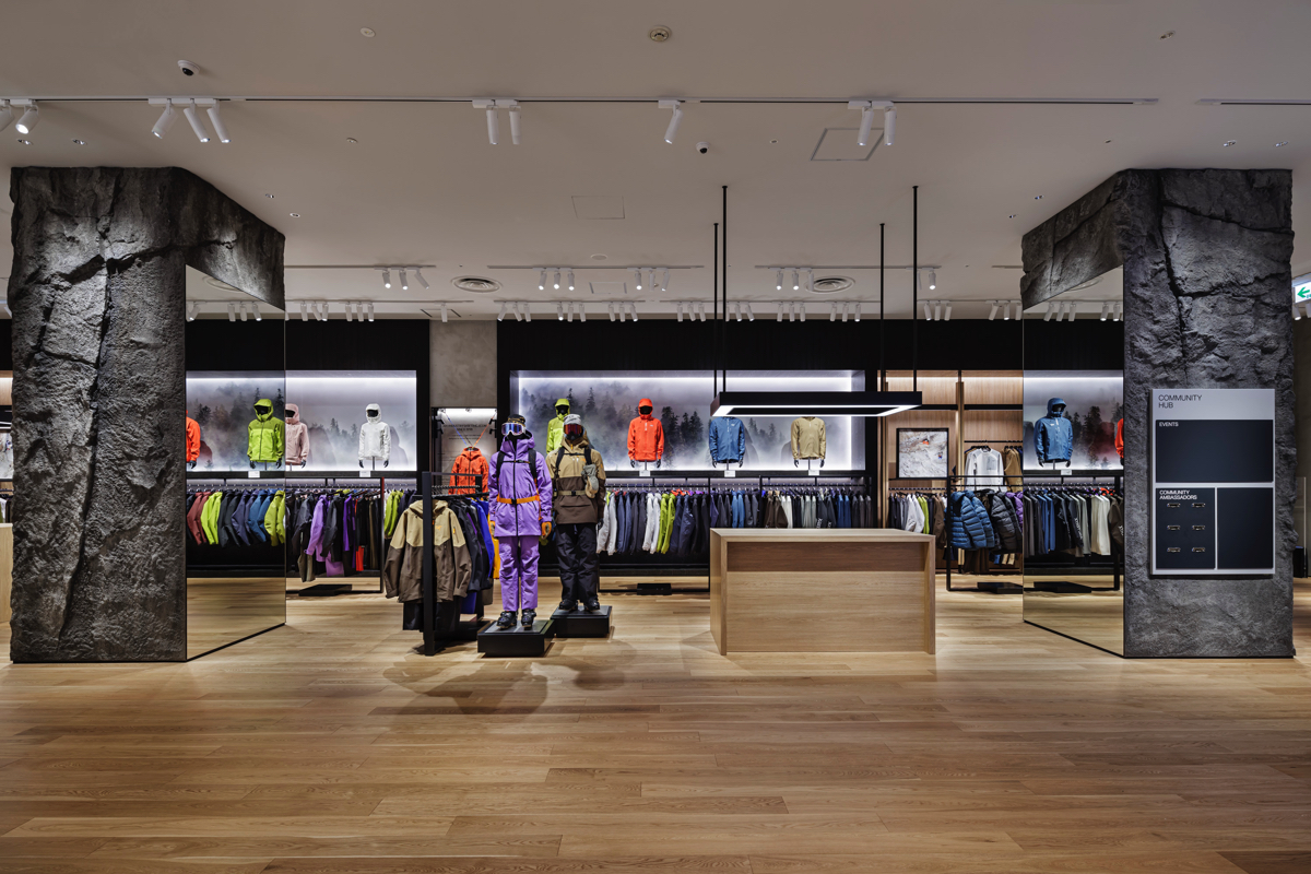 天井の高さ、素材の質感、照明の陰影に至るまで、訪れる人がアークテリクスの世界観を体で感じる設計だ。