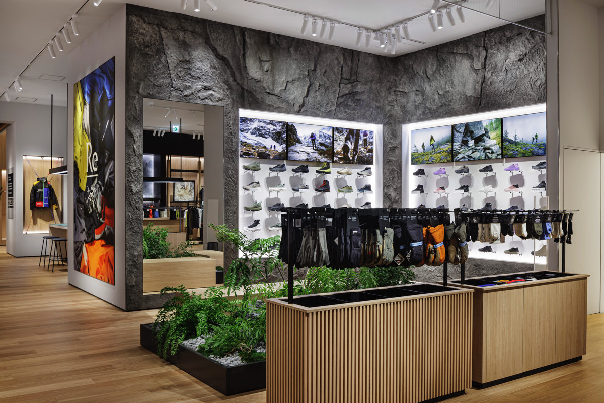 壁面にはアルパインの風景が広がり、マネキンが纏うのは都市に生きる登山者を想起させるスタイル。自然素材と金属を組み合わせたインテリアが、ブランドの哲学「機能とデザインの融合」を静かに語る。