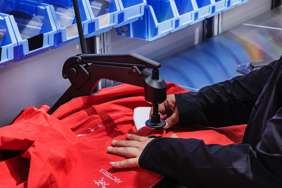 もうひとつは、来店者が気軽に参加できるチャームづくり。アークテリクスのアパレル端材であるゴアテックス残布とリボンを組み合わせて、世界にひとつだけのチャームを作る。防水性と耐久性を誇る素材に触れながら、“機能を長く保つ”というブランドの哲学を手のひらで感じられる。