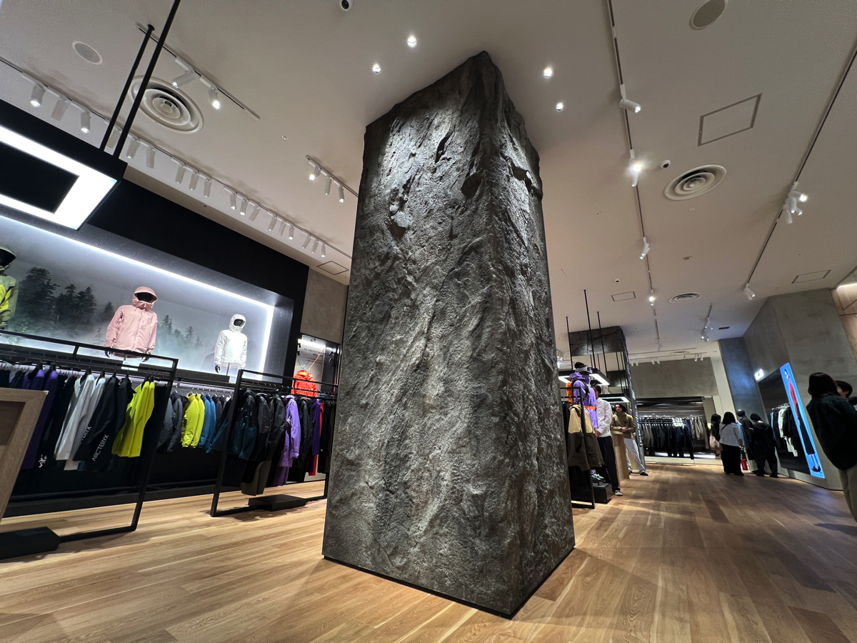 ▲天井は高く確保されており、数字以上に広々とした空間。柱にはアークテリクス本社近くのクライミングエリア、スコーミッシュの岩肌を表現した内装も施される。