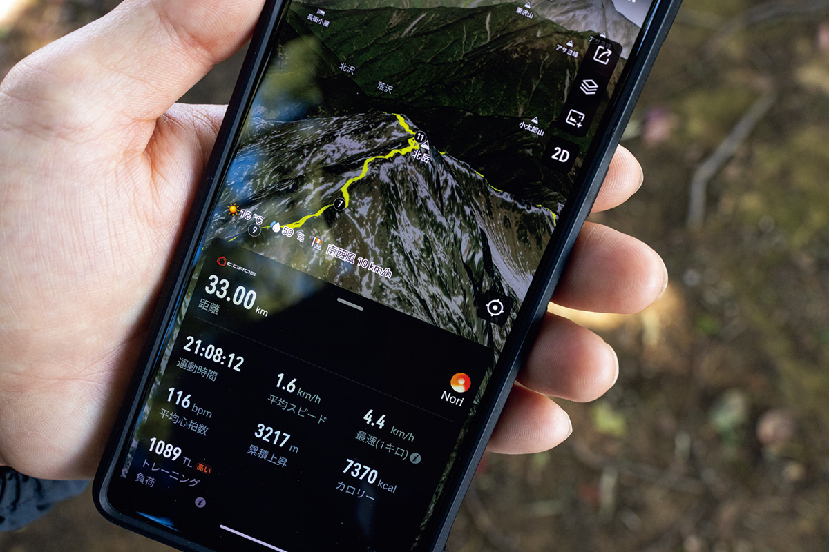 GPSウォッチは山の必需品ではないが、ルートや身体に関わるさまざま情報が確認でき、さらに予定ルートを外れたらお知らせなどもしてくれる。試しにちょっと使ってみようと思ったときに注視したいのは、筐体の丈夫さと、バッテリーのもち。デジタルデバイスといえど、〝山道具〞として見ることが大事だ。