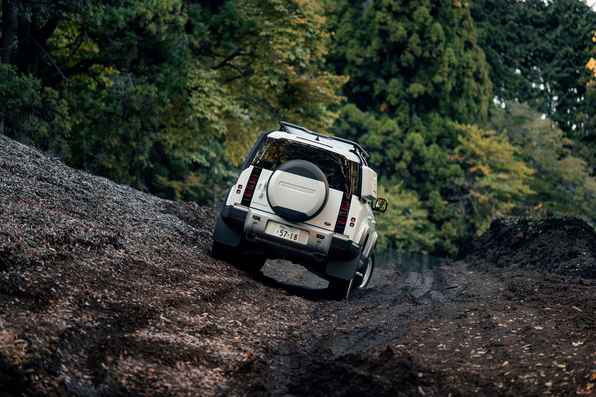 インストラクターによるドライブで高さ5m、最大傾斜43度の専用スロープを現行ディフェンダーで試乗したが、「旧ディフェンダーでは上ることさえできない!」と思えるほどの急傾斜。それをスリップ音も一切なく上り、下りへ移行する際のサスペンションの伸び縮みによる姿勢変化も感じることなく、路面にピタッと張り付いたようにそしてシームレスに前へ進むことに驚きを隠せなかった。