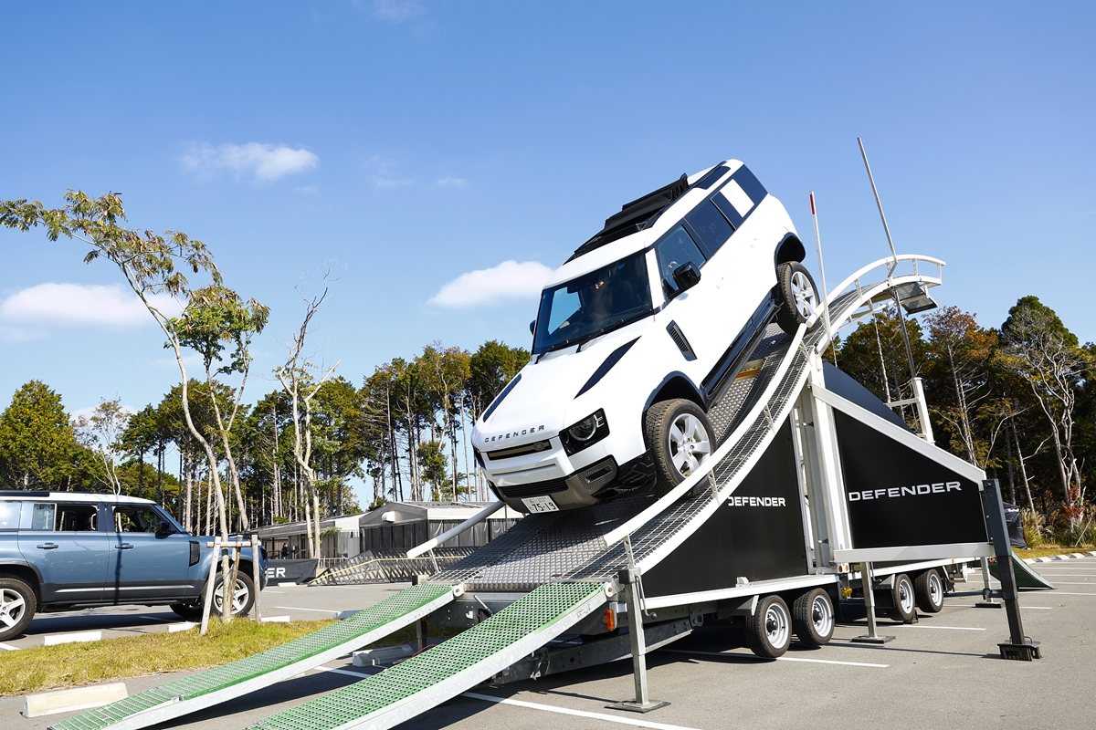 インストラクターによるドライブで高さ5m、最大傾斜43度の専用スロープを現行ディフェンダーで試乗したが、「旧ディフェンダーでは上ることさえできない!」と思えるほどの急傾斜。それをスリップ音も一切なく上り、下りへ移行する際のサスペンションの伸び縮みによる姿勢変化も感じることなく、路面にピタッと張り付いたようにそしてシームレスに前へ進むことに驚きを隠せなかった。